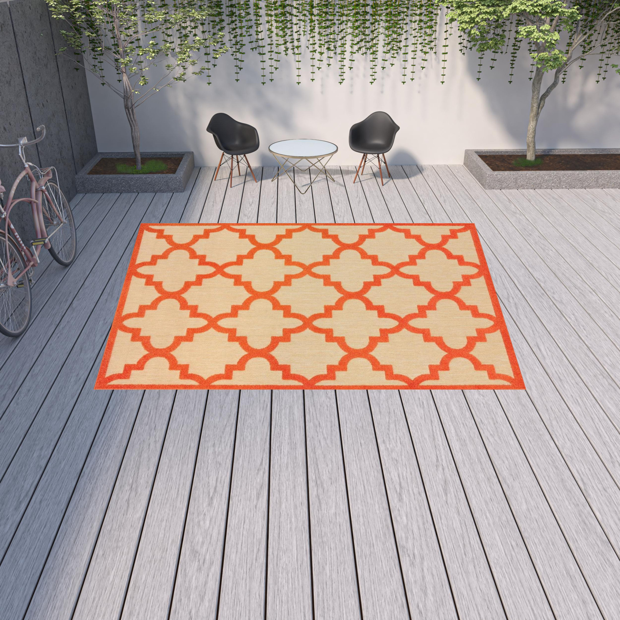 This 10-foot x 13-foot orange geometric stain resistant indoor outdoor area rug, is a great way to add warmth to a room. This rectangle shaped rug features a geometric design in orange to give it visual interest. A classic shape marries with good looking design for your space Ideal for spaces with kids and pets, this rug is stain resistant to help repel stains and spilled liquids. Place this area rug against a hardwood or tile floor and it will enliven your living space with style and sophistication. 0.07-inch H x 118.11-inch W x 153.54-inch D
