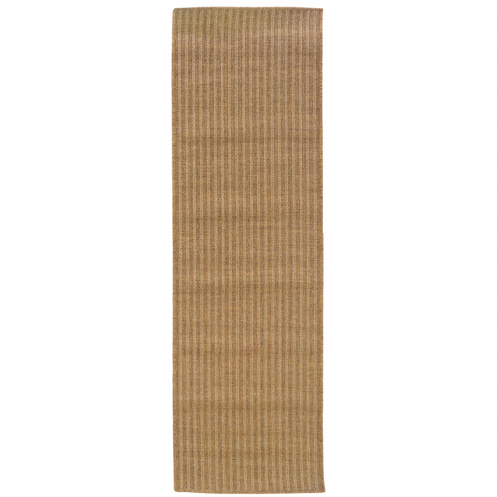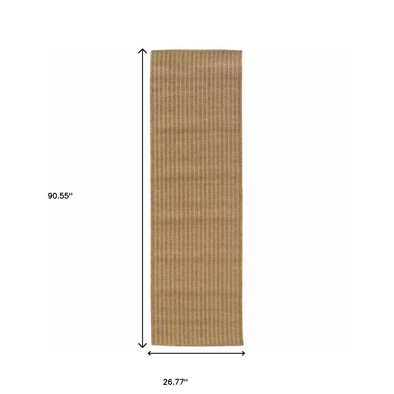 Set an inviting tone in your space with this 2-foot x 8-foot tan striped stain resistant indoor outdoor area rug. This rectangle shaped rug features a striped design in tan to give it visual interest. A classic shape marries with good looking design for your space Ideal for spaces with kids and pets, this rug is stain resistant to help repel stains and spilled liquids. Area Rugs help to give warmth and sense of home to your space. 0.16-inch H x 26.77-inch W x 90.55-inch D