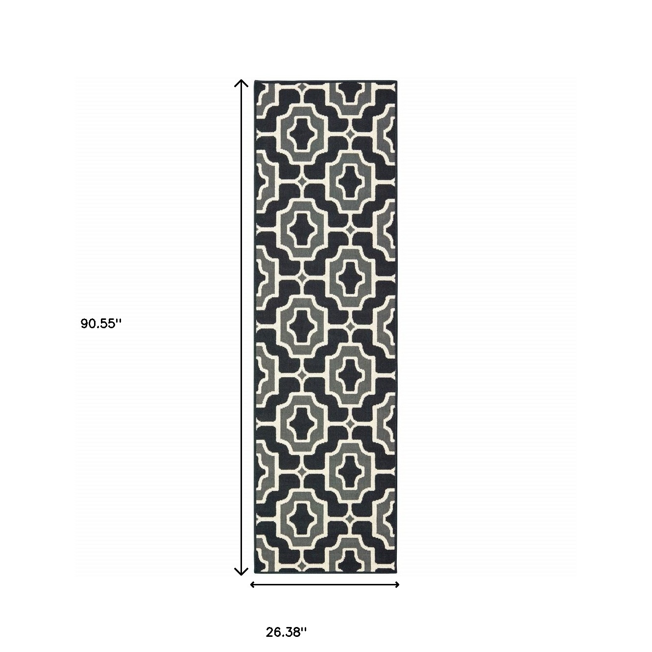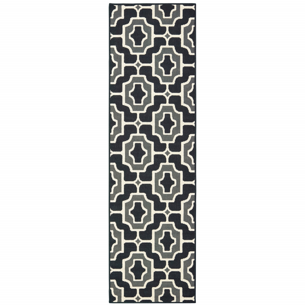 Set an inviting tone in your space with this 2-foot x 8-foot black and gray geometric stain resistant indoor outdoor area rug. This rectangle shaped rug features a geometric design in black and gray to give it visual interest. A classic shape marries with good looking design for your space Ideal for spaces with kids and pets, this rug is stain resistant to help repel stains and spilled liquids. Area Rugs help to give warmth and sense of home to your space. 0.07-inch H x 26.38-inch W x 90.55-inch D