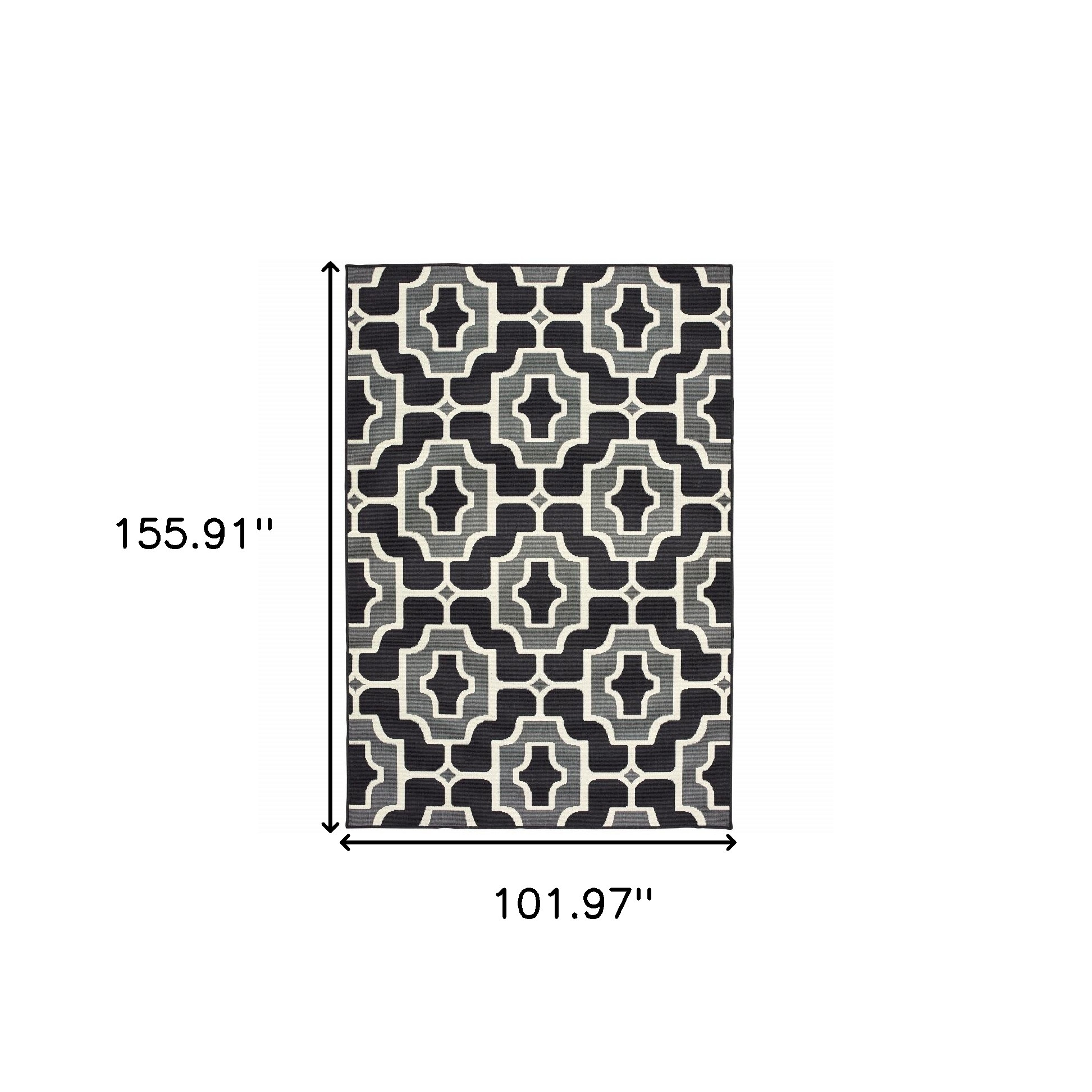 This 9-foot x 13-foot black and gray geometric stain resistant indoor outdoor area rug, is a great way to add warmth to a room. This rectangle shaped rug features a geometric design in black and gray to give it visual interest. A classic shape marries with good looking design for your space Ideal for spaces with kids and pets, this rug is stain resistant to help repel stains and spilled liquids. Place this area rug against a hardwood or tile floor and it will enliven your living space with style and sophistication. 0.07-inch H x 101.97-inch W x 155.91-inch D