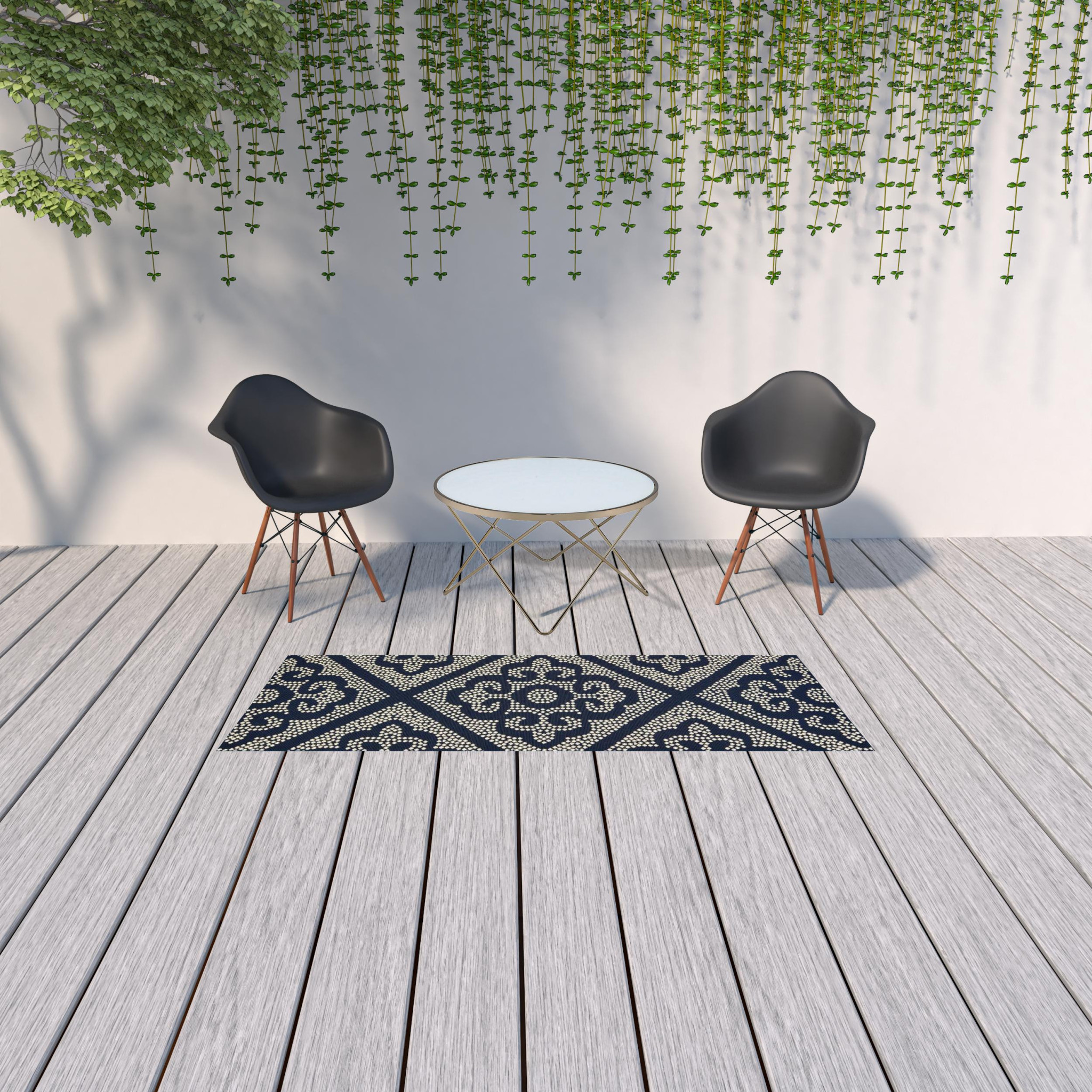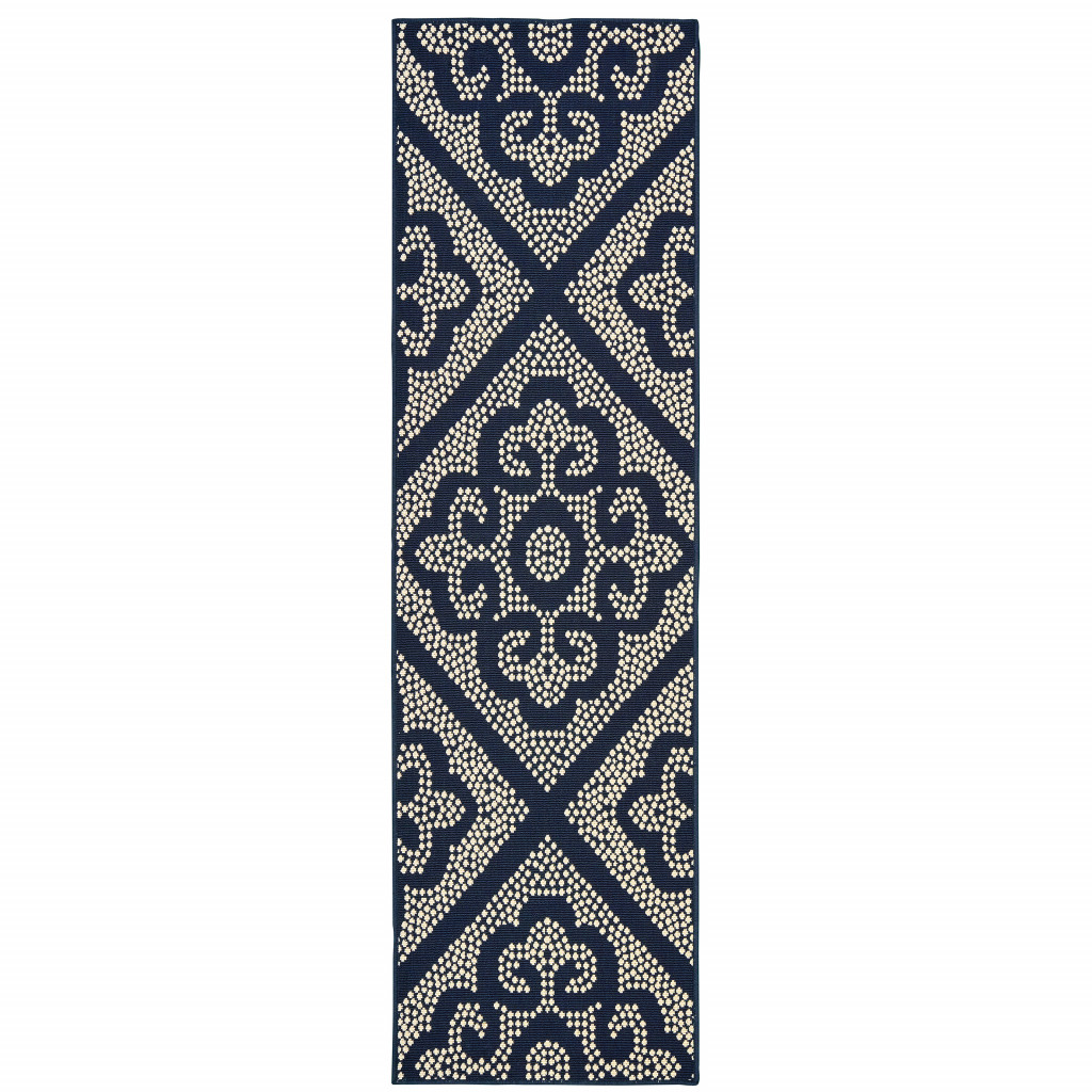 Set an inviting tone in your space with this 2-foot x 8-foot blue and ivory geometric stain resistant indoor outdoor area rug. This rectangle shaped rug features a geometric design in blue and ivory to give it visual interest. A classic shape marries with good looking design for your space Ideal for spaces with kids and pets, this rug is stain resistant to help repel stains and spilled liquids. Place this area rug against a hardwood or tile floor and it will enliven your living space with style and sophistication. 0.11-inch H x 26.38-inch W x 90.55-inch D