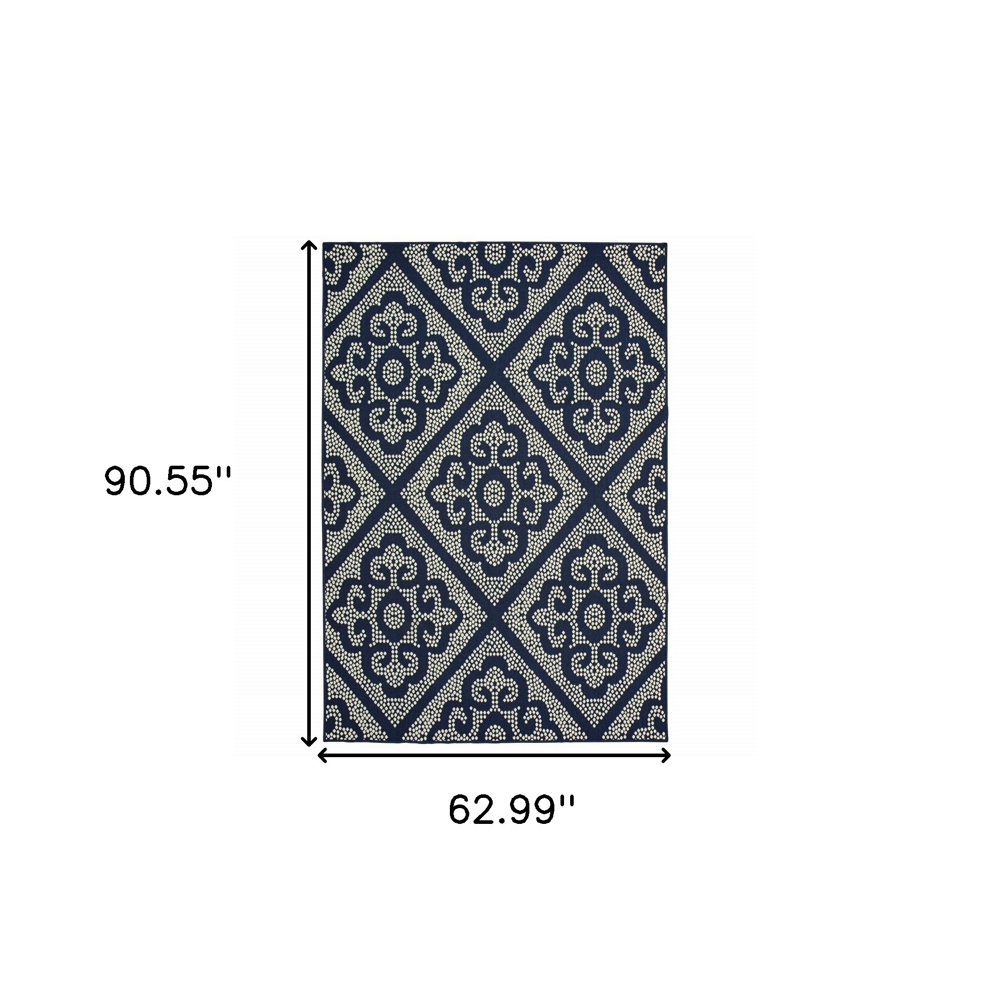 Add some artistry to your room with this 5-foot x 8-foot blue and ivory geometric stain resistant indoor outdoor area rug. This rectangle shaped rug features a geometric design in blue and ivory to give it visual interest. A classic shape marries with good looking design for your space Ideal for spaces with kids and pets, this rug is stain resistant to help repel stains and spilled liquids. Area Rugs help to give warmth and sense of home to your space. 0.07-inch H x 62.99-inch W x 90.55-inch D