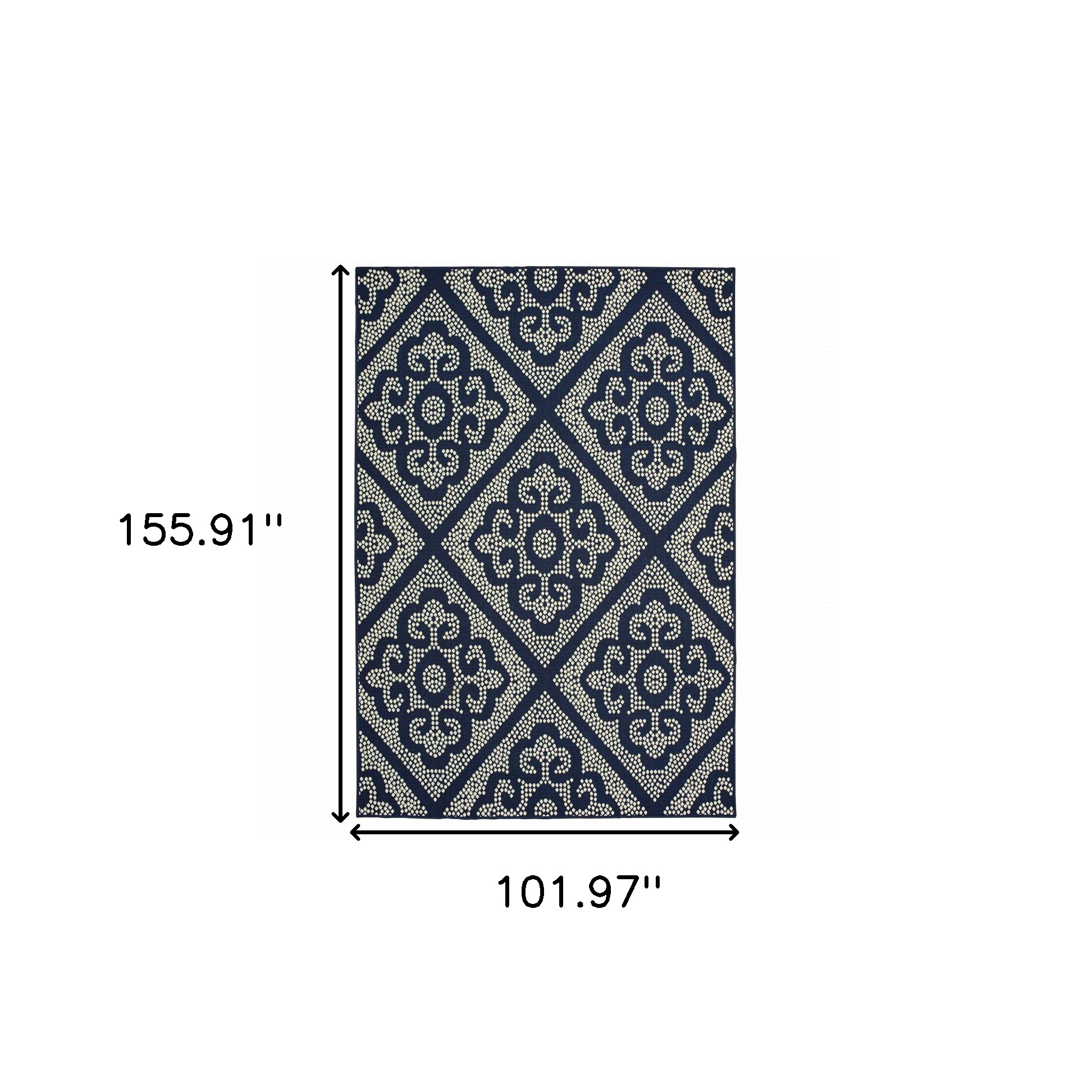 Add great coloration and comfortable texture to your space with this 9-foot x 13-foot blue and ivory geometric stain resistant indoor outdoor area rug. This rectangle shaped rug features a geometric design in blue and ivory to give it visual interest. A classic shape marries with good looking design for your space Ideal for spaces with kids and pets, this rug is stain resistant to help repel stains and spilled liquids. Place this area rug against a hardwood or tile floor and it will enliven your living space with style and sophistication. 0.07-inch H x 101.97-inch W x 155.91-inch D