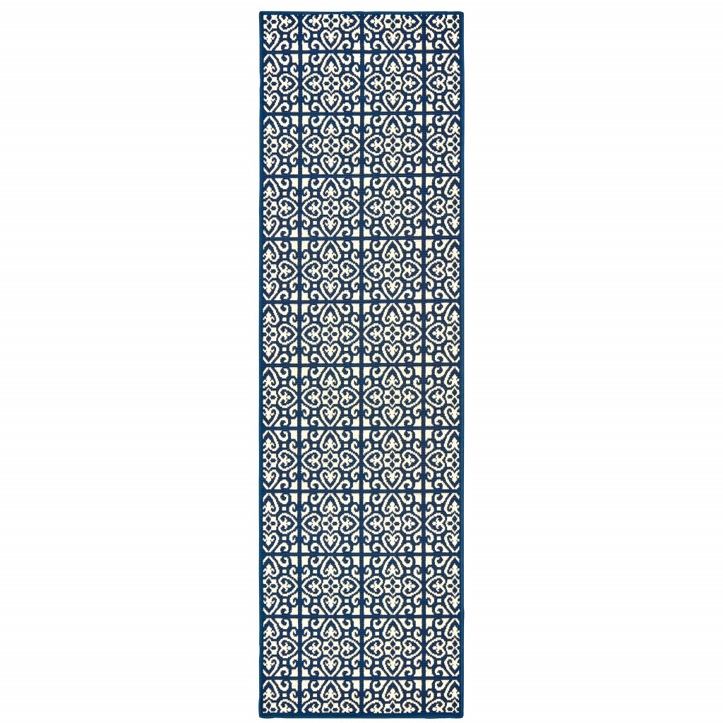 Add great coloration and comfortable texture to your space with this 2-foot x 8-foot ivory and blue geometric stain resistant indoor outdoor area rug. This rectangle shaped rug features a geometric design in ivory and blue to give it visual interest. A classic shape marries with good looking design for your space Ideal for spaces with kids and pets, this rug is stain resistant to help repel stains and spilled liquids. Area Rugs help to give warmth and sense of home to your space. 0.07-inch H x 26.38-inch W x 90.55-inch D