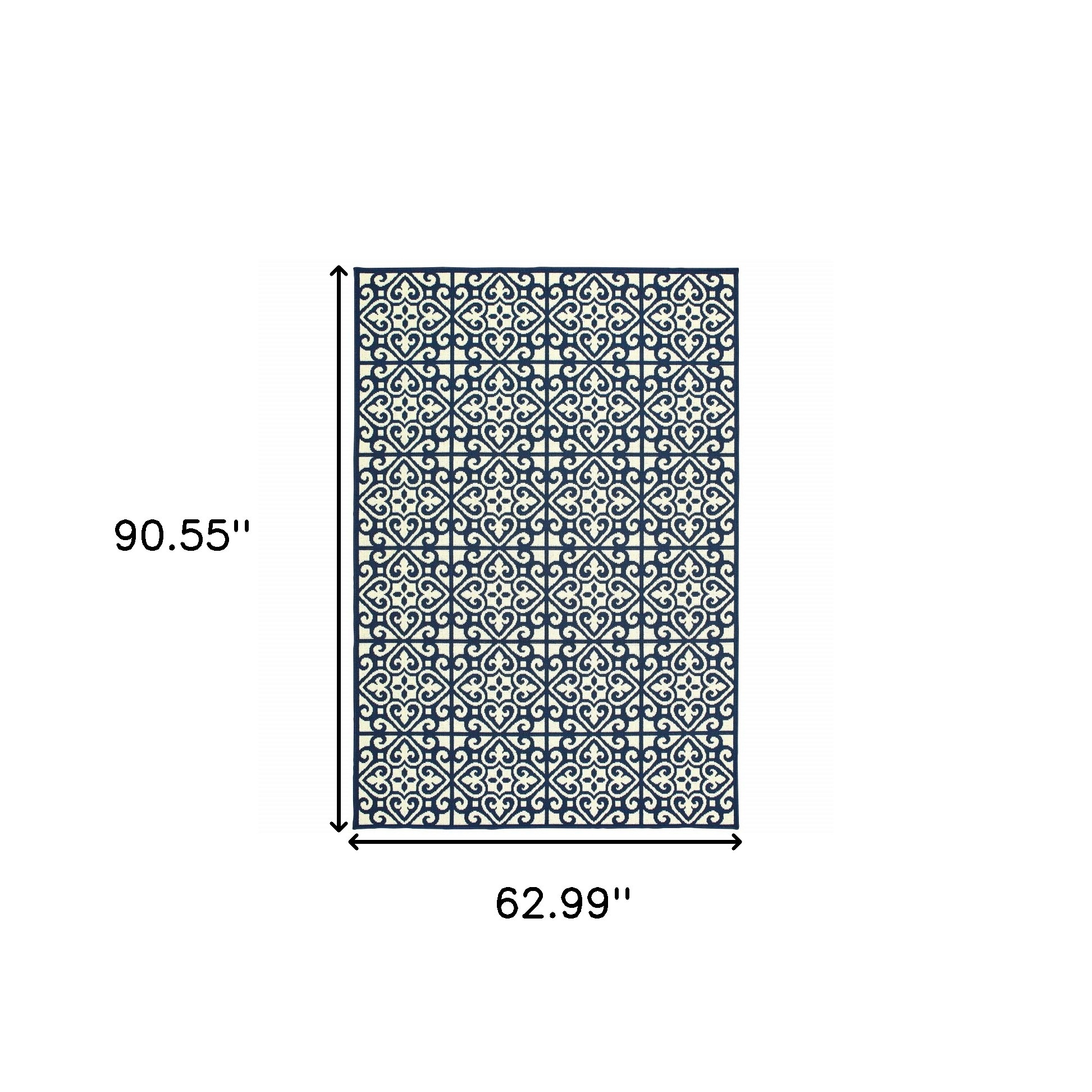 Add some artistry to your room with this 5-foot x 8-foot ivory and blue geometric stain resistant indoor outdoor area rug. This rectangle shaped rug features a geometric design in ivory and blue to give it visual interest. A classic shape marries with good looking design for your space Ideal for spaces with kids and pets, this rug is stain resistant to help repel stains and spilled liquids. Area Rugs help to give warmth and sense of home to your space. 0.07-inch H x 62.99-inch W x 90.55-inch D
