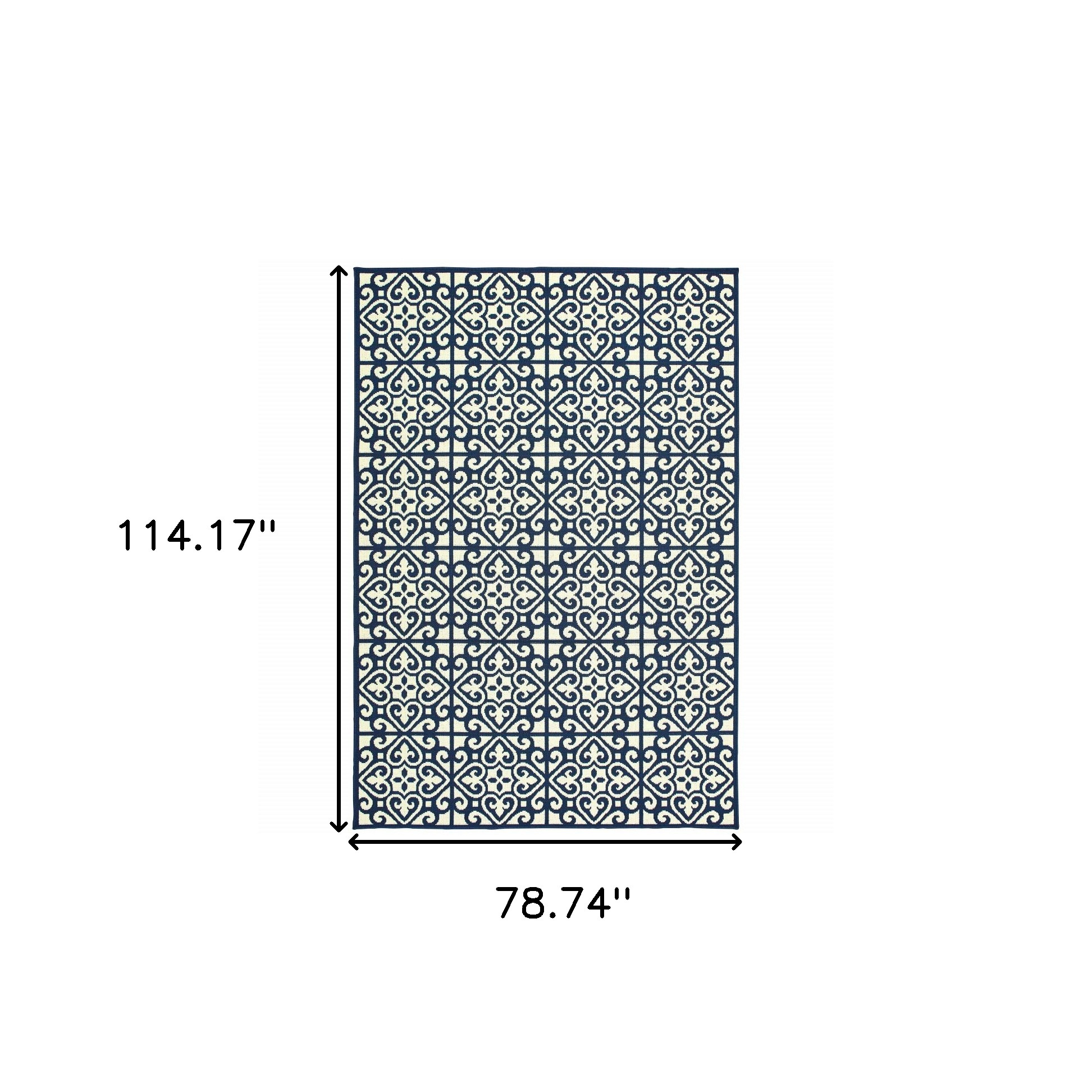 Set an inviting tone in your space with this 7-foot x 10-foot ivory and blue geometric stain resistant indoor outdoor area rug. This rectangle shaped rug features a geometric design in ivory and blue to give it visual interest. A classic shape marries with good looking design for your space Ideal for spaces with kids and pets, this rug is stain resistant to help repel stains and spilled liquids. Place this area rug against a hardwood or tile floor and it will enliven your living space with style and sophistication. 0.07-inch H x 78.74-inch W x 114.17-inch D
