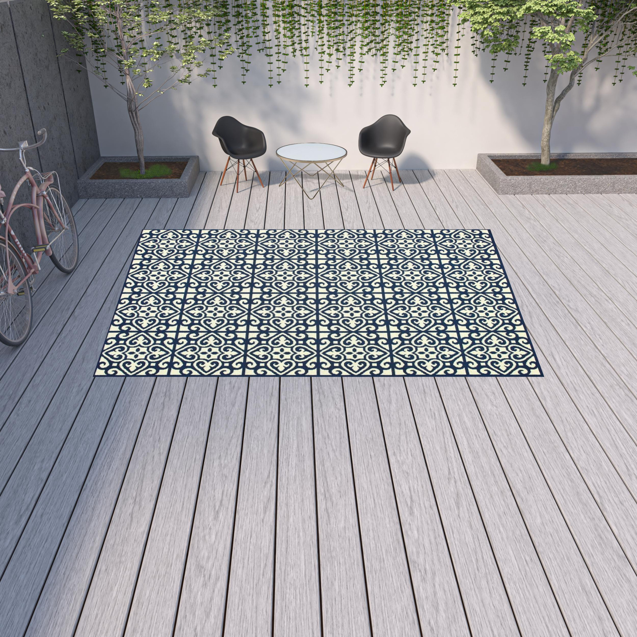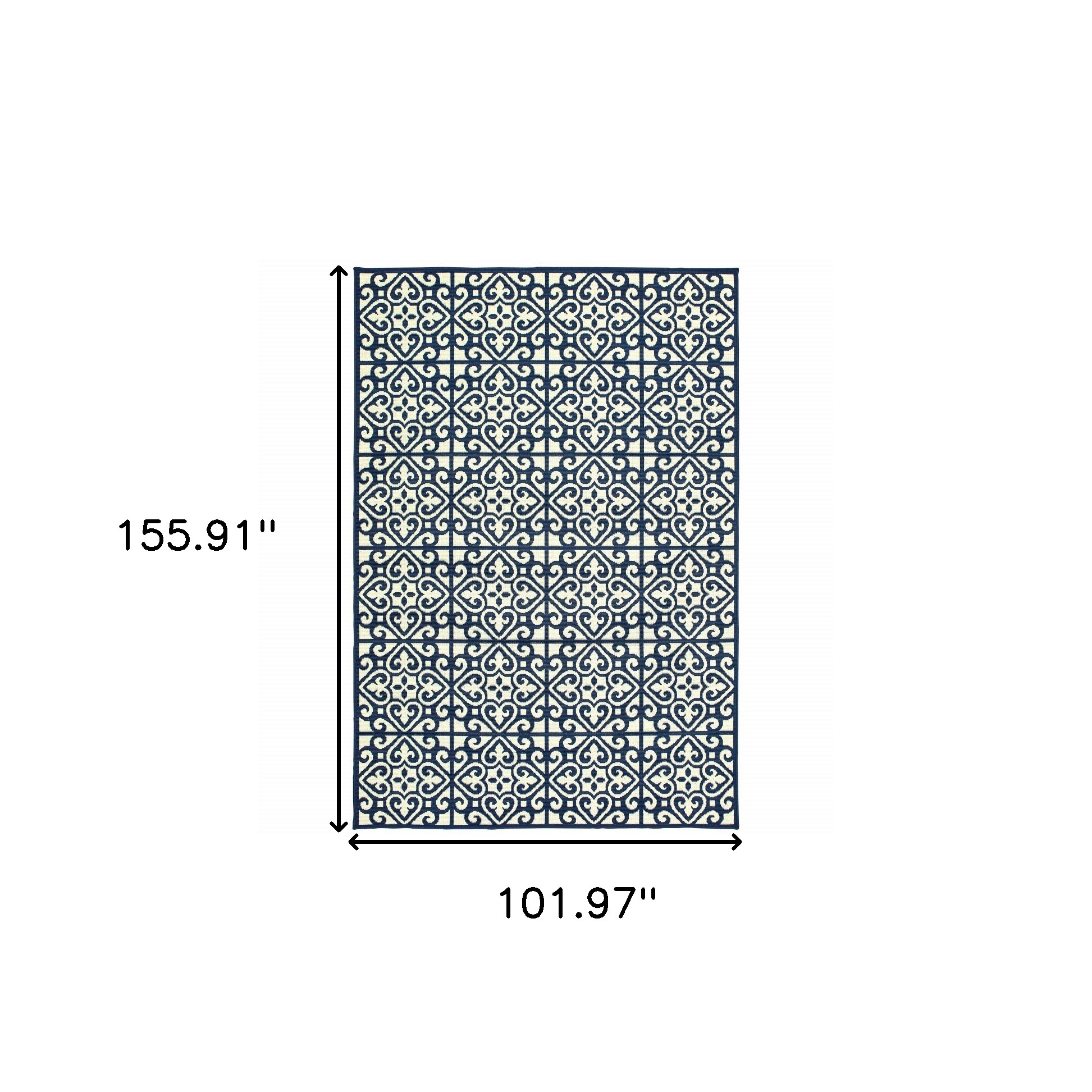 Add some artistry to your room with this 9-foot x 13-foot ivory and blue geometric stain resistant indoor outdoor area rug. This rectangle shaped rug features a geometric design in ivory and blue to give it visual interest. A classic shape marries with good looking design for your space Ideal for spaces with kids and pets, this rug is stain resistant to help repel stains and spilled liquids. Place this area rug against a hardwood or tile floor and it will enliven your living space with style and sophistication. 0.07-inch H x 101.97-inch W x 155.91-inch D
