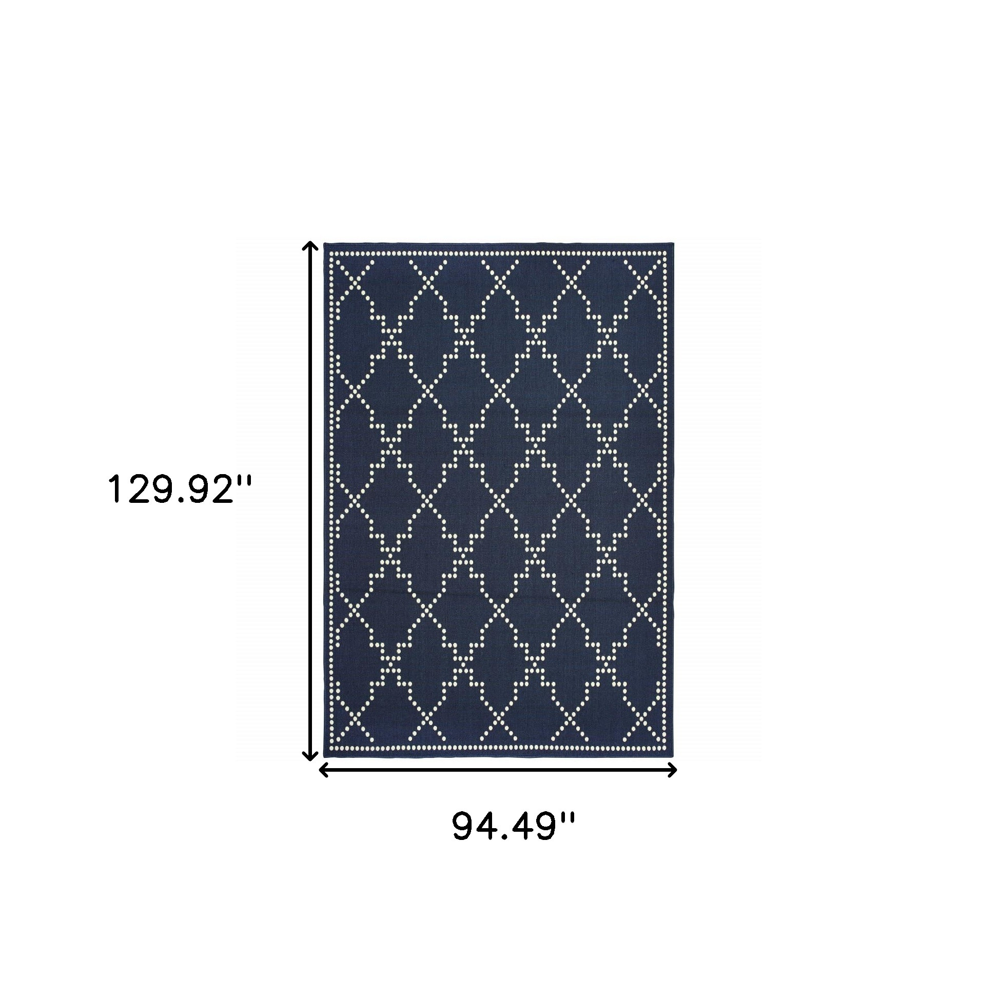Add some artistry to your room with this 8-foot x 11-foot blue and ivory geometric stain resistant indoor outdoor area rug. This rectangle shaped rug features a geometric design in blue and ivory to give it visual interest. A classic shape marries with good looking design for your space Ideal for spaces with kids and pets, this rug is stain resistant to help repel stains and spilled liquids. Area Rugs help to give warmth and sense of home to your space. 0.07-inch H x 94.49-inch W x 129.92-inch D