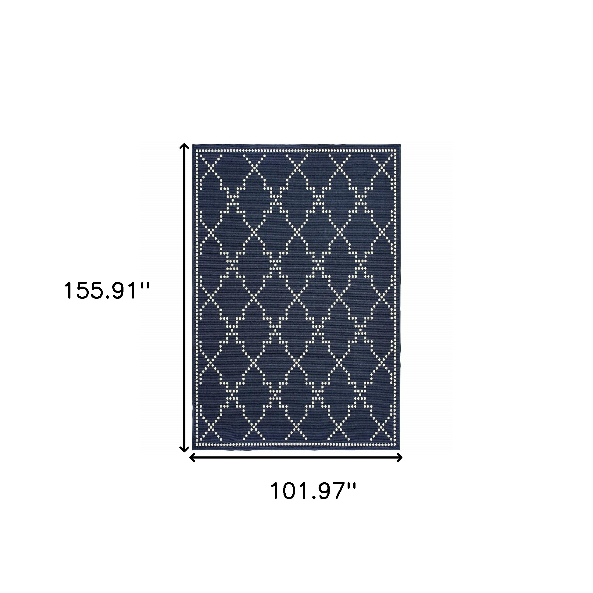 Set an inviting tone in your space with this 9-foot x 13-foot blue and ivory geometric stain resistant indoor outdoor area rug. This rectangle shaped rug features a geometric design in blue and ivory to give it visual interest. A classic shape marries with good looking design for your space Ideal for spaces with kids and pets, this rug is stain resistant to help repel stains and spilled liquids. Area Rugs help to give warmth and sense of home to your space. 0.07-inch H x 101.97-inch W x 155.91-inch D