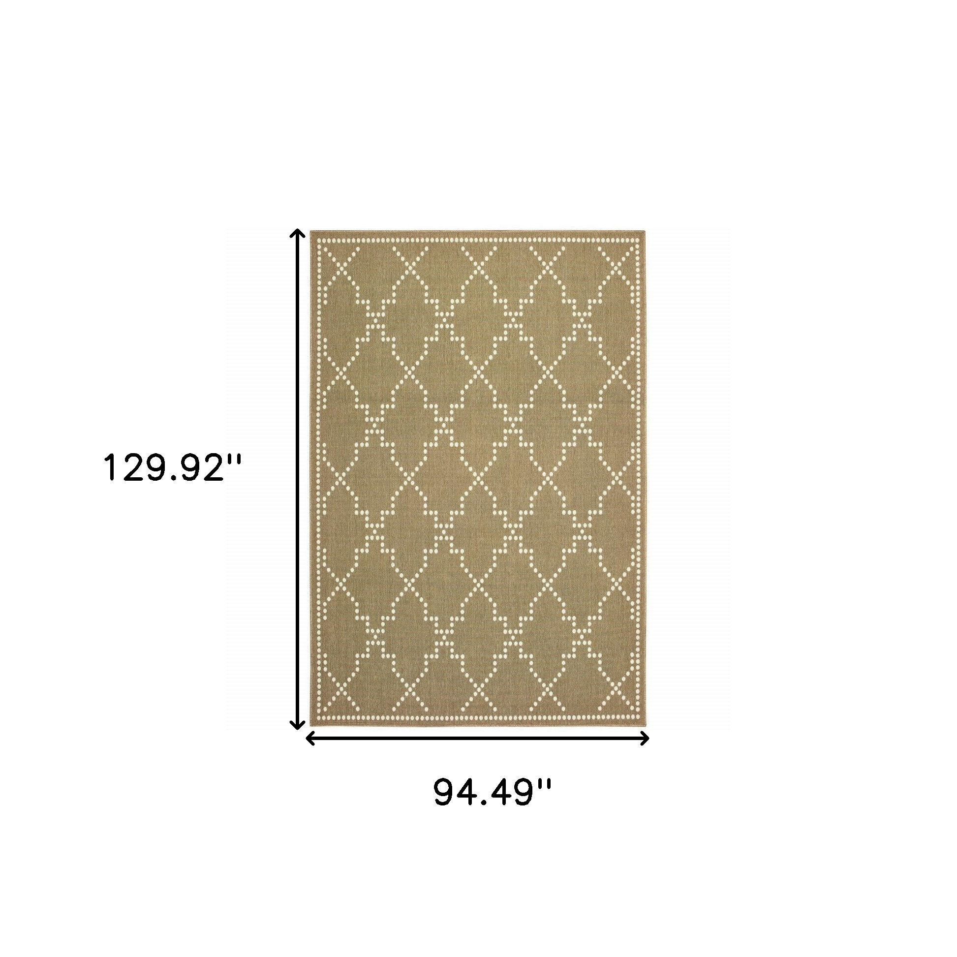 This 8-foot x 11-foot tan geometric stain resistant indoor outdoor area rug, is a great way to add warmth to a room. This rectangle shaped rug features a geometric design in tan to give it visual interest. A classic shape marries with good looking design for your space Ideal for spaces with kids and pets, this rug is stain resistant to help repel stains and spilled liquids. Area Rugs help to give warmth and sense of home to your space. 0.07-inch H x 94.49-inch W x 129.92-inch D