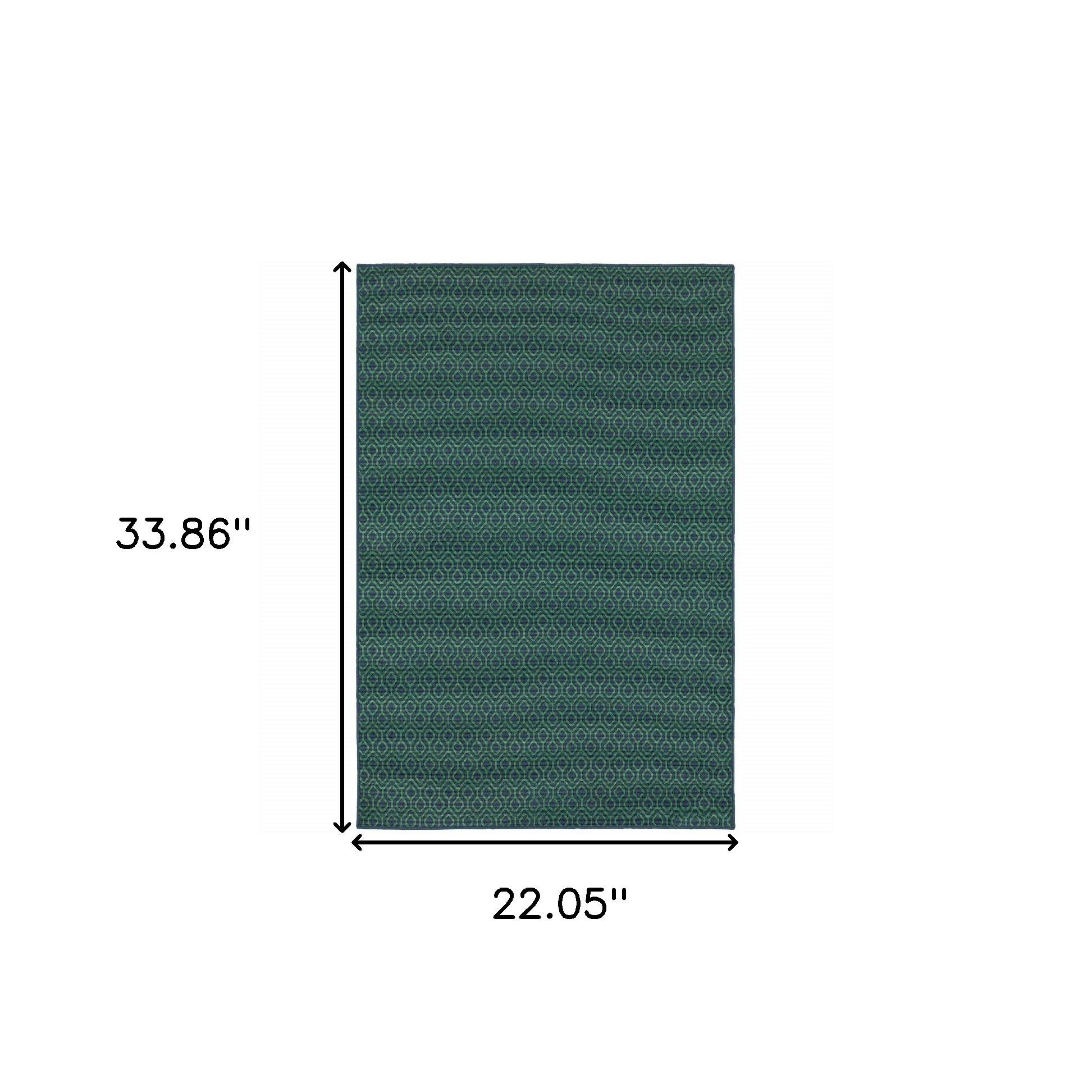 Add some artistry to your room with this 2-foot x 3-foot blue and green geometric stain resistant indoor outdoor area rug. This rectangle shaped rug features a geometric design in blue and green to give it visual interest. A classic shape marries with good looking design for your space Ideal for spaces with kids and pets, this rug is stain resistant to help repel stains and spilled liquids. Place this area rug against a hardwood or tile floor and it will enliven your living space with style and sophistication. 0.15-inch H x 22.05-inch W x 33.86-inch D
