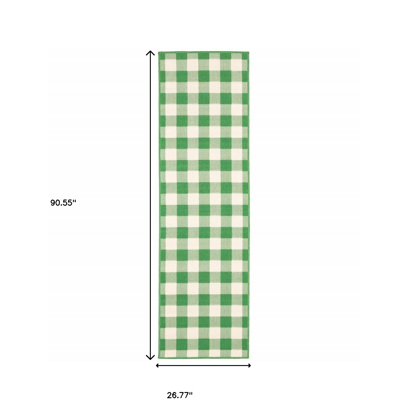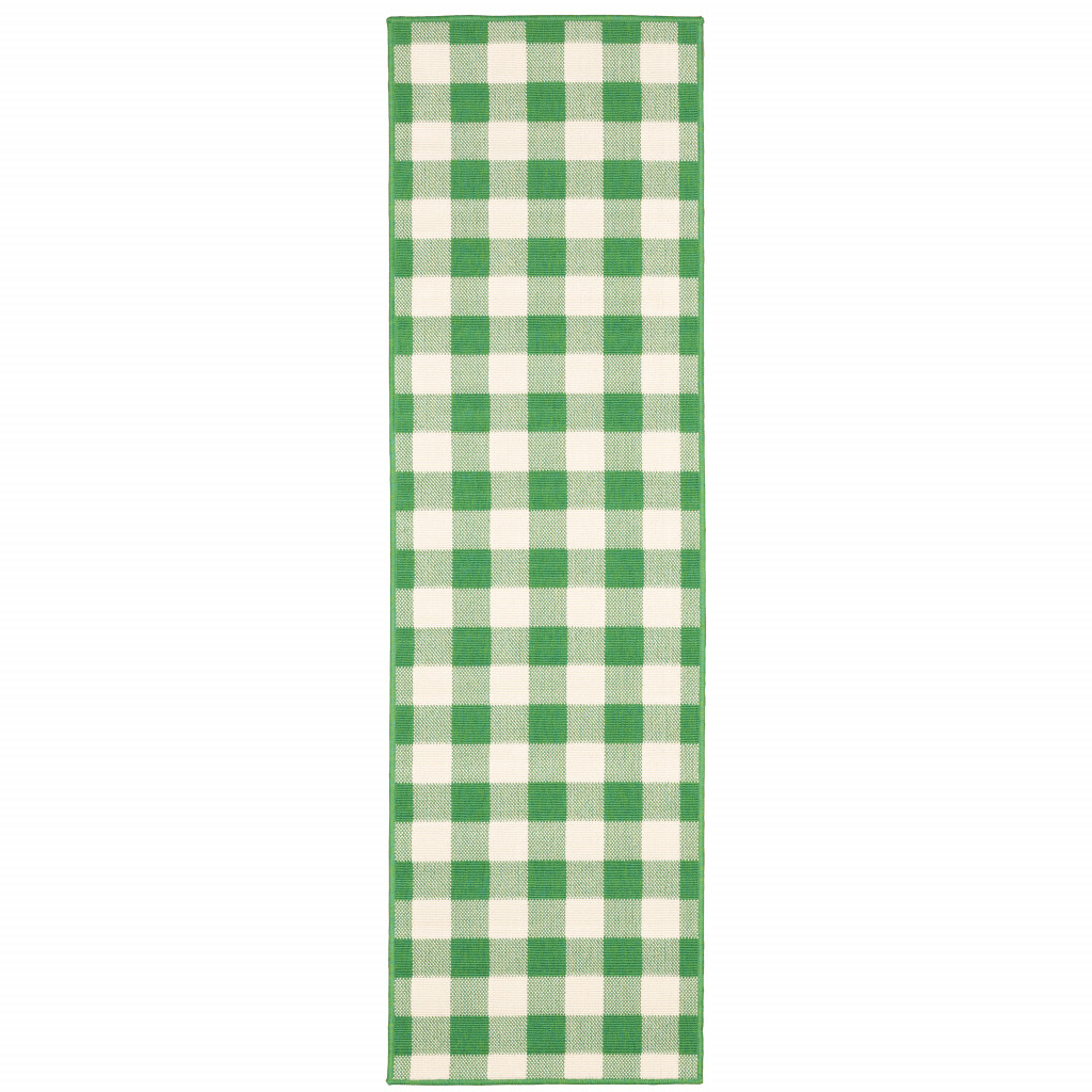 Set an inviting tone in your space with this 2-foot x 8-foot green and ivory geometric stain resistant indoor outdoor area rug. This rectangle shaped rug features a geometric design in green and ivory to give it visual interest. A classic shape marries with good looking design for your space Ideal for spaces with kids and pets, this rug is stain resistant to help repel stains and spilled liquids. Place this area rug against a hardwood or tile floor and it will enliven your living space with style and sophistication. 0.15-inch H x 26.77-inch W x 90.55-inch D