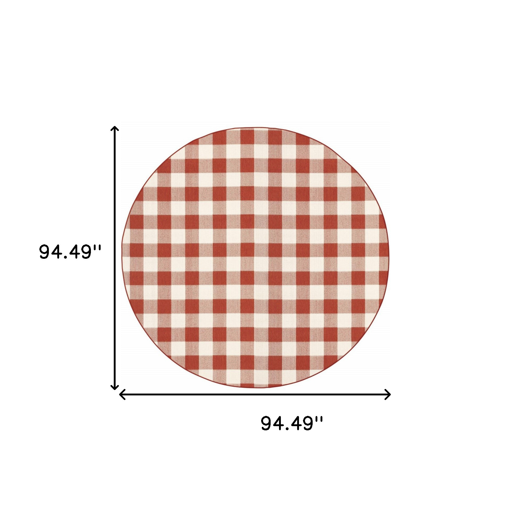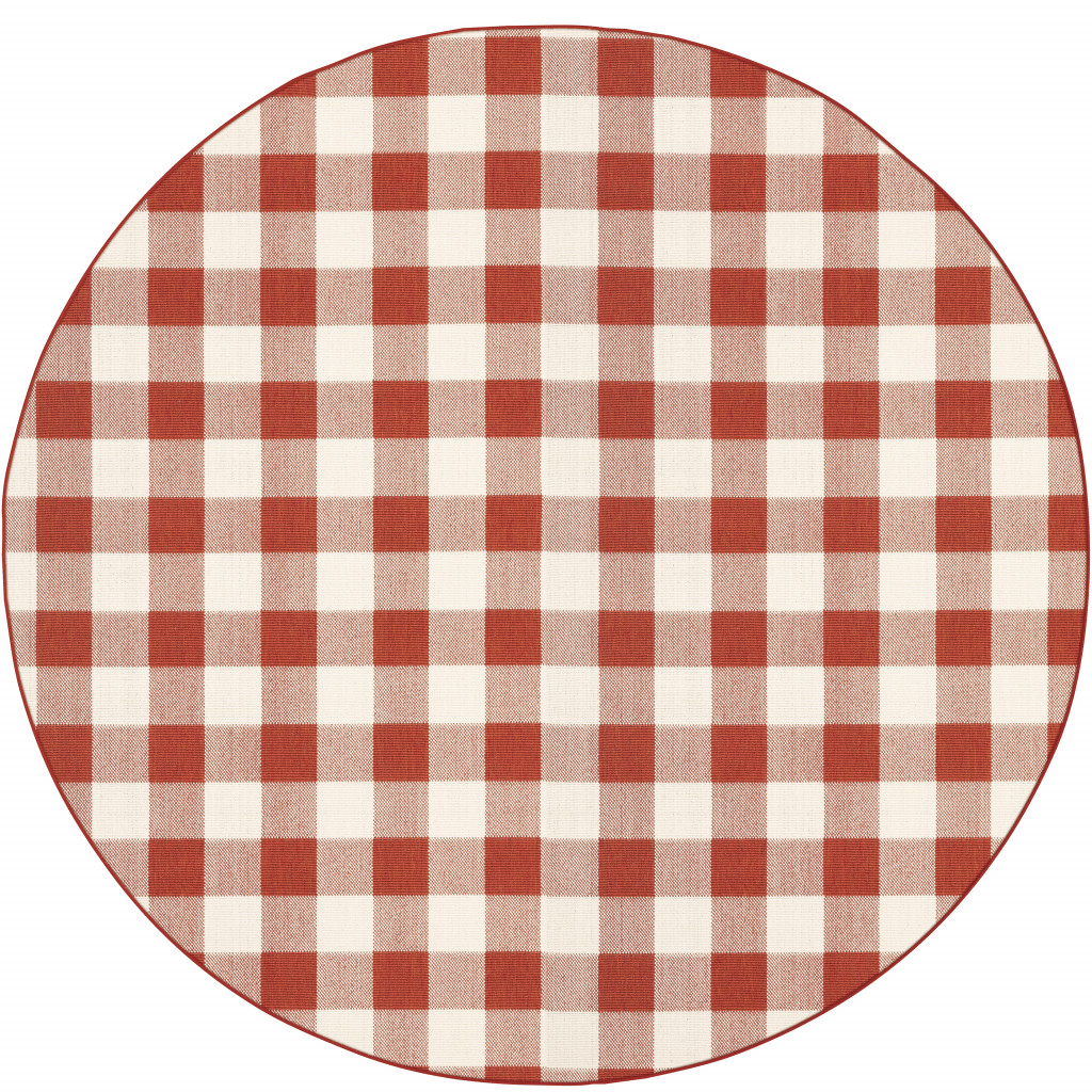 Add some artistry to your room with this 8-foot x 8-foot red and ivory round geometric stain resistant indoor outdoor area rug. This geometric round shaped rug features a geometric pattern in red and ivory that combines a good looking print with a unique and updated shape. The mix of shape, color, and design gives this rug refreshing visual interest. Ideal for spaces with kids and pets, this rug is stain resistant to help repel stains and spilled liquids. Place this area rug against a hardwood or tile floor and it will enliven your living space with style and sophistication. 0.15-inch H x 94.49-inch W x 94.49-inch D