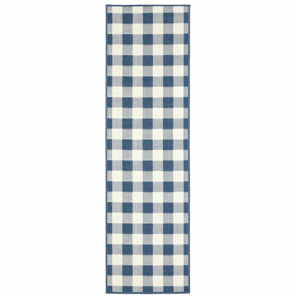 Add great coloration and comfortable texture to your space with this 2-foot x 8-foot blue and ivory geometric stain resistant indoor outdoor area rug. This rectangle shaped rug features a geometric design in blue and ivory to give it visual interest. A classic shape marries with good looking design for your space Ideal for spaces with kids and pets, this rug is stain resistant to help repel stains and spilled liquids. Place this area rug against a hardwood or tile floor and it will enliven your living space with style and sophistication. 0.15-inch H x 26.77-inch W x 90.55-inch D