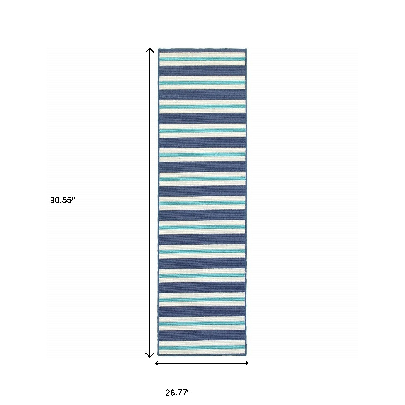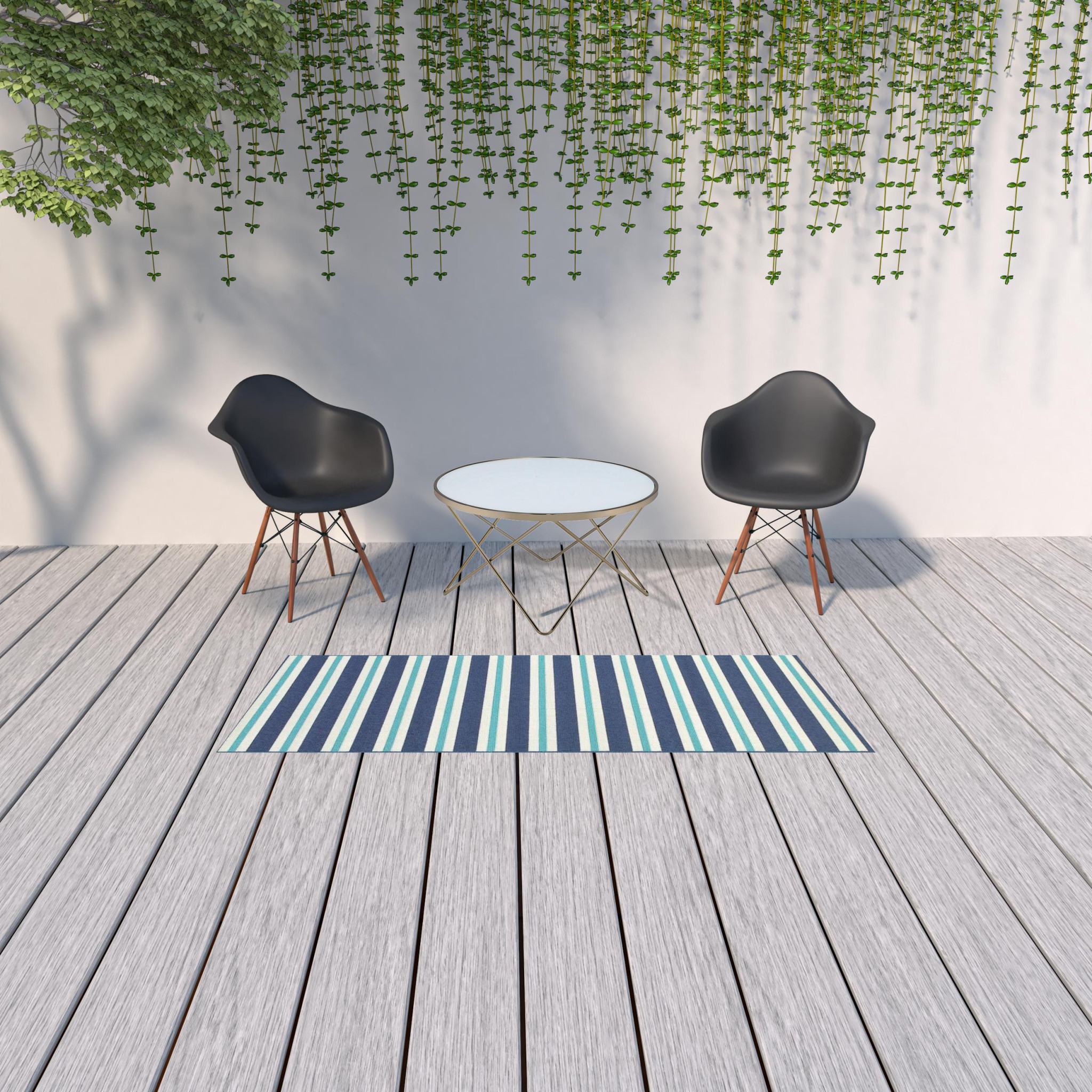 Set an inviting tone in your space with this 2-foot x 8-foot blue and ivory geometric stain resistant indoor outdoor area rug. This rectangle shaped rug features a geometric design in blue and ivory to give it visual interest. A classic shape marries with good looking design for your space Ideal for spaces with kids and pets, this rug is stain resistant to help repel stains and spilled liquids. Place this area rug against a hardwood or tile floor and it will enliven your living space with style and sophistication. 0.15-inch H x 26.77-inch W x 90.55-inch D