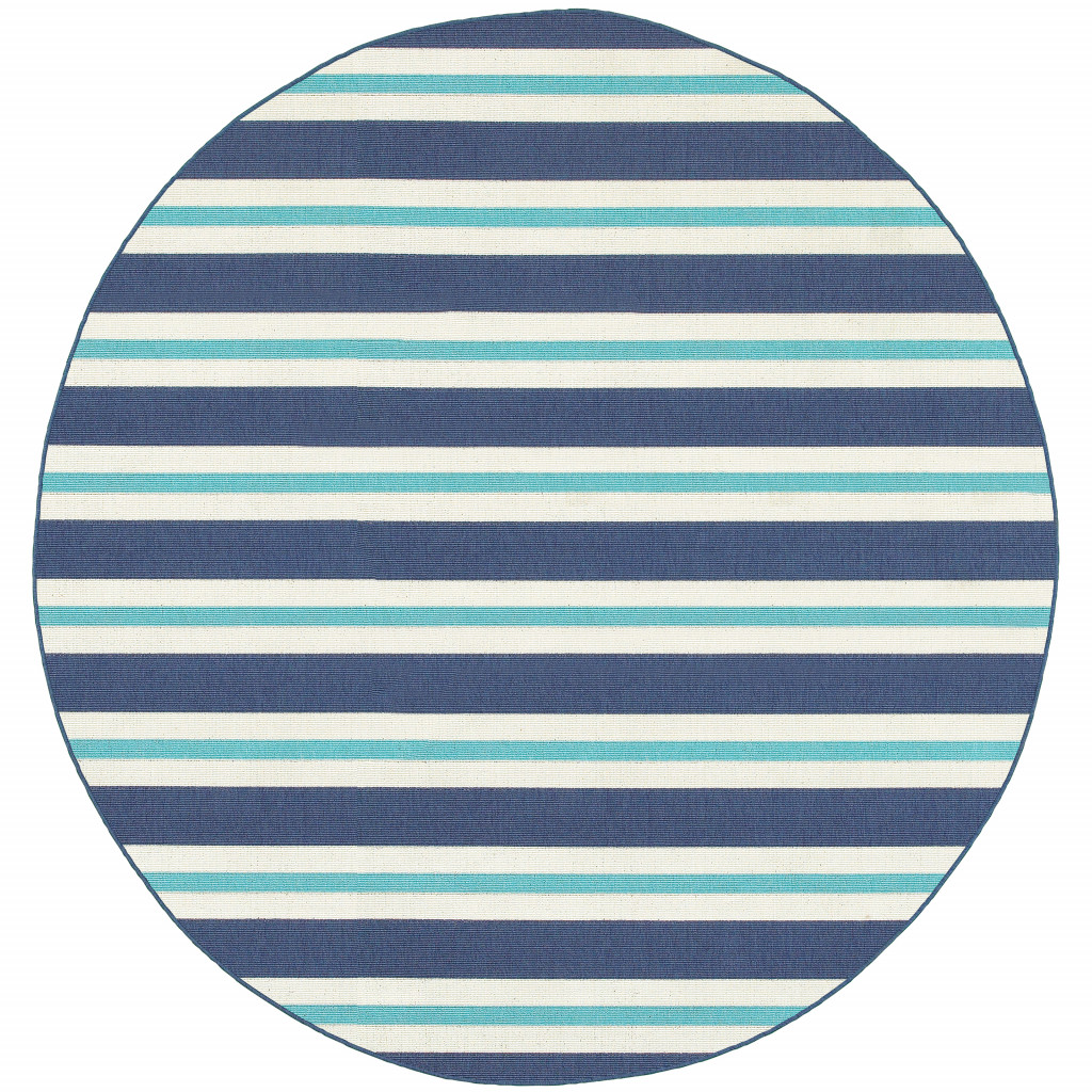 8' X 8' Blue and Ivory Round Geometric Stain Resistant Indoor Outdoor Area Rug