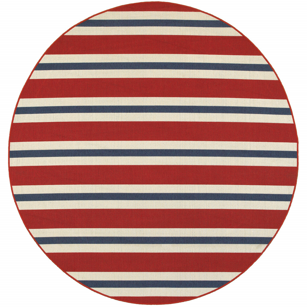 This 8-foot x 8-foot red and ivory round geometric stain resistant indoor outdoor area rug, is a great way to add warmth to a room. This geometric round shaped rug features a geometric pattern in red and ivory that combines a good looking print with a unique and updated shape. The mix of shape, color, and design gives this rug refreshing visual interest. Ideal for spaces with kids and pets, this rug is stain resistant to help repel stains and spilled liquids. Place this area rug against a hardwood or tile floor and it will enliven your living space with style and sophistication. 0.15-inch H x 94.49-inch W x 94.49-inch D