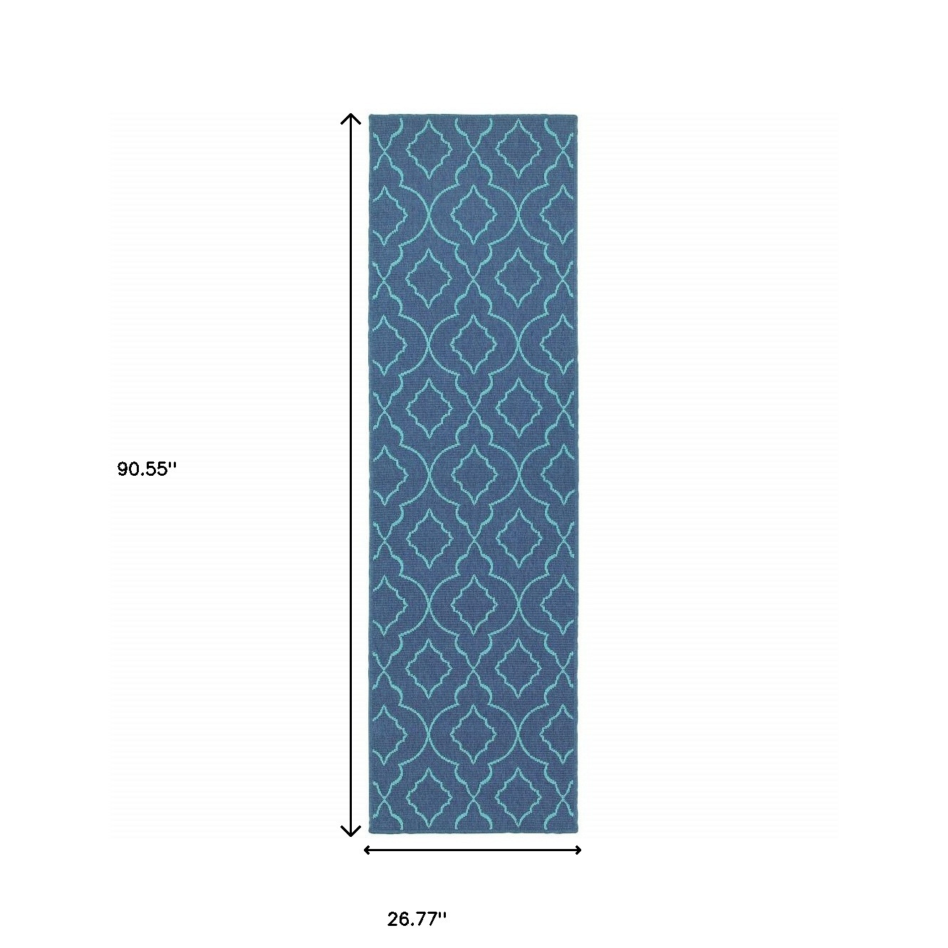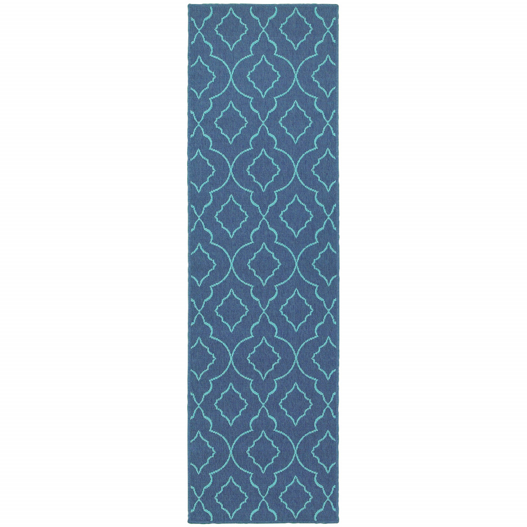 Set an inviting tone in your space with this 2-foot x 8-foot blue geometric stain resistant indoor outdoor area rug. This rectangle shaped rug features a geometric design in blue to give it visual interest. A classic shape marries with good looking design for your space Ideal for spaces with kids and pets, this rug is stain resistant to help repel stains and spilled liquids. Area Rugs help to give warmth and sense of home to your space. 0.15-inch H x 26.77-inch W x 90.55-inch D