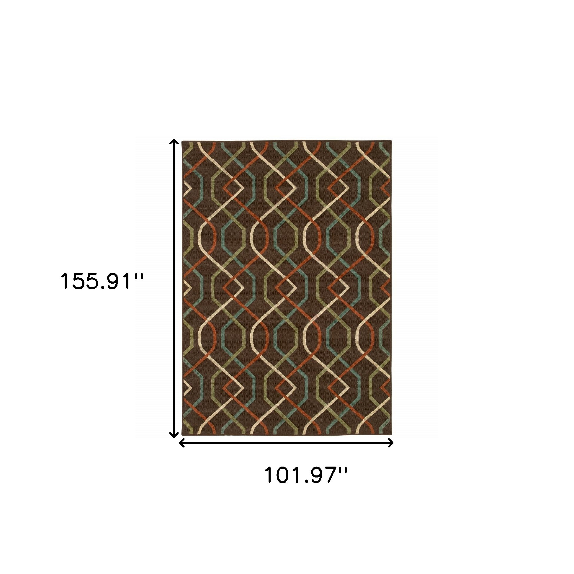 Set an inviting tone in your space with this 9-foot x 13-foot brown and ivory geometric stain resistant indoor outdoor area rug. This rectangle shaped rug features a geometric design in brown and ivory to give it visual interest. A classic shape marries with good looking design for your space Ideal for spaces with kids and pets, this rug is stain resistant to help repel stains and spilled liquids. Place this area rug against a hardwood or tile floor and it will enliven your living space with style and sophistication. 0.16-inch H x 101.97-inch W x 155.91-inch D