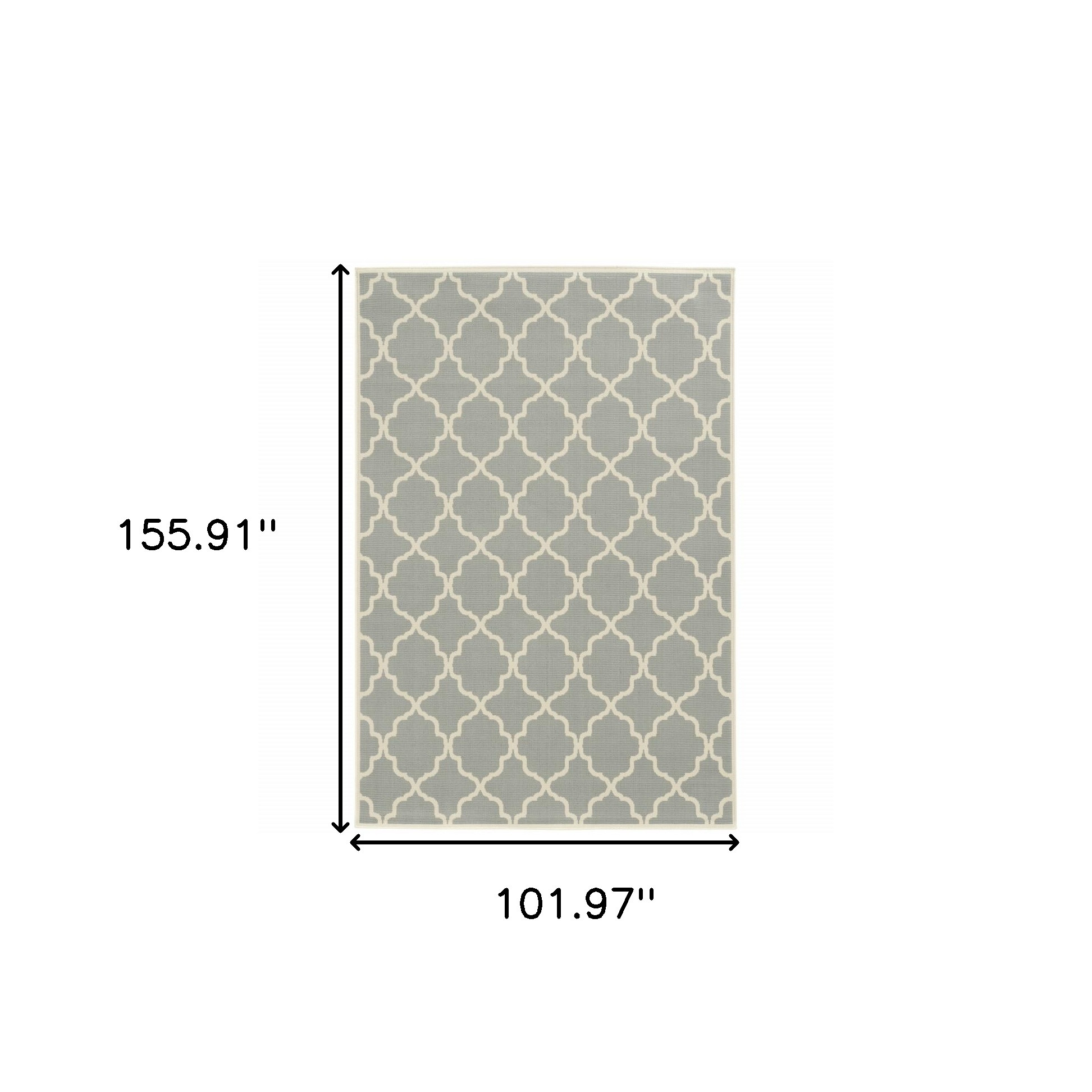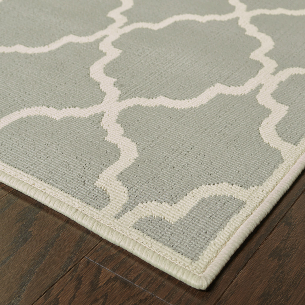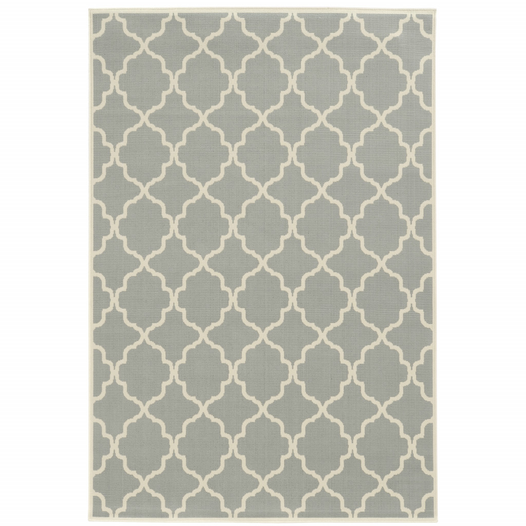 Set an inviting tone in your space with this 9-foot x 13-foot gray and ivory geometric stain resistant indoor outdoor area rug. This rectangle shaped rug features a geometric design in gray and ivory to give it visual interest. A classic shape marries with good looking design for your space Ideal for spaces with kids and pets, this rug is stain resistant to help repel stains and spilled liquids. Area Rugs help to give warmth and sense of home to your space. 0.16-inch H x 101.97-inch W x 155.91-inch D