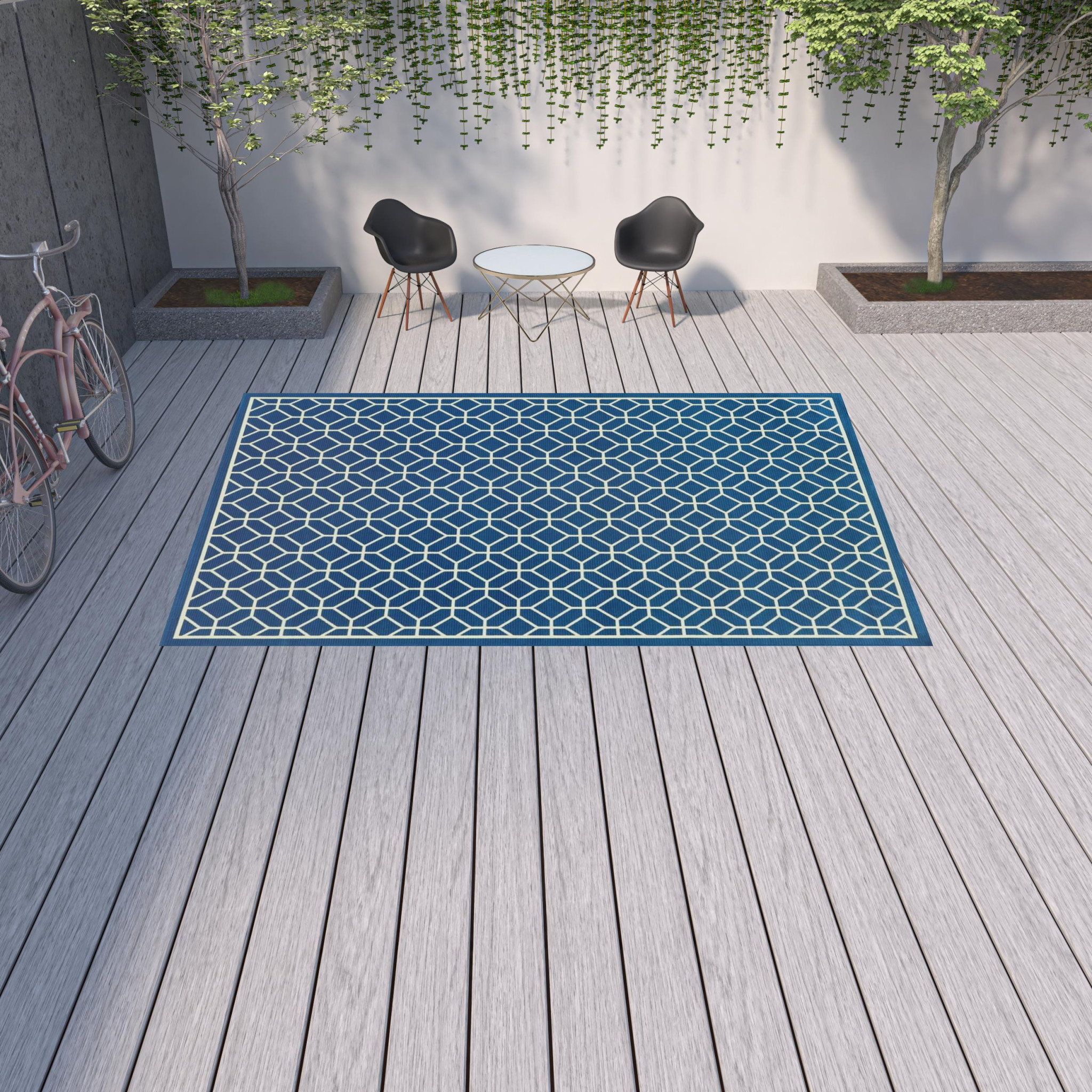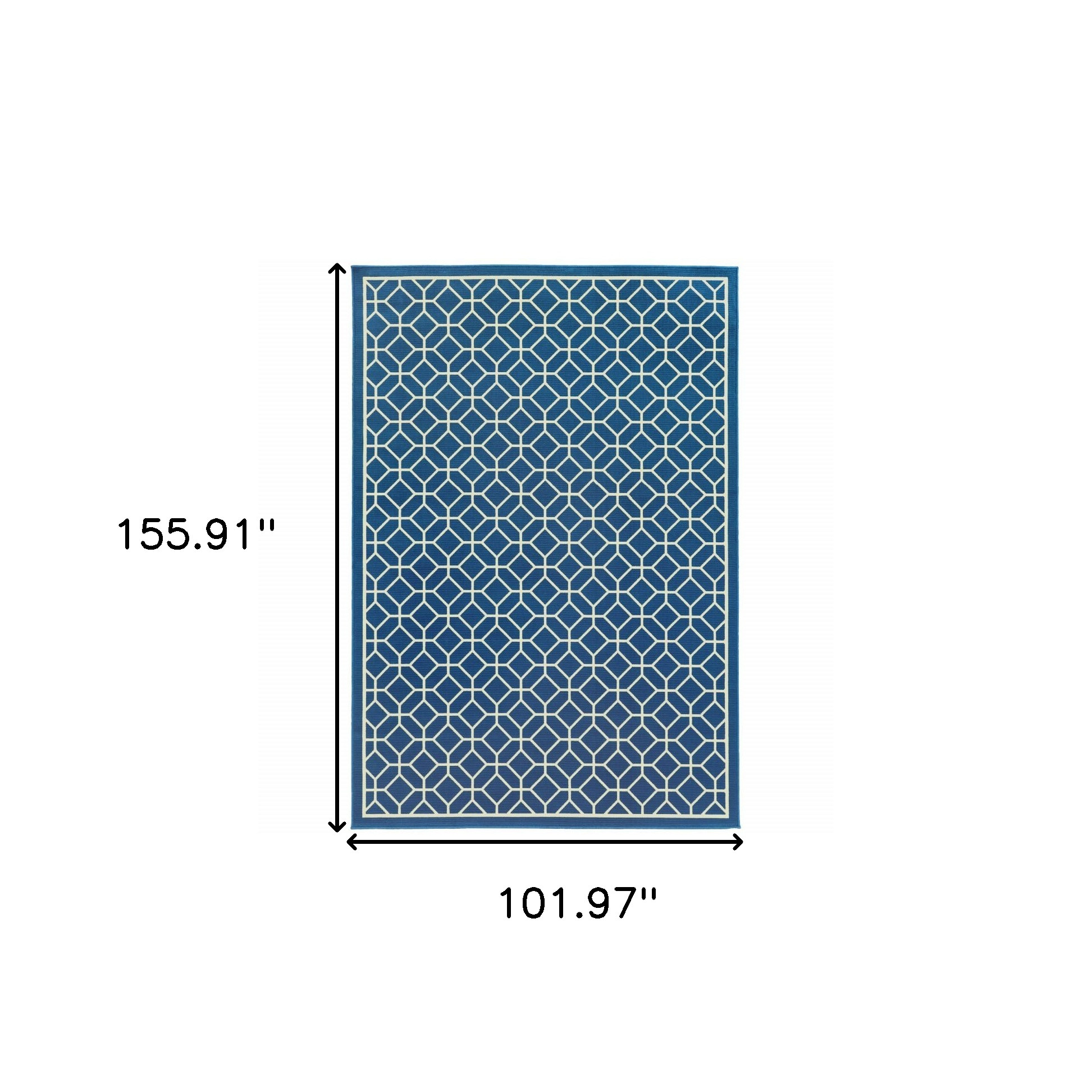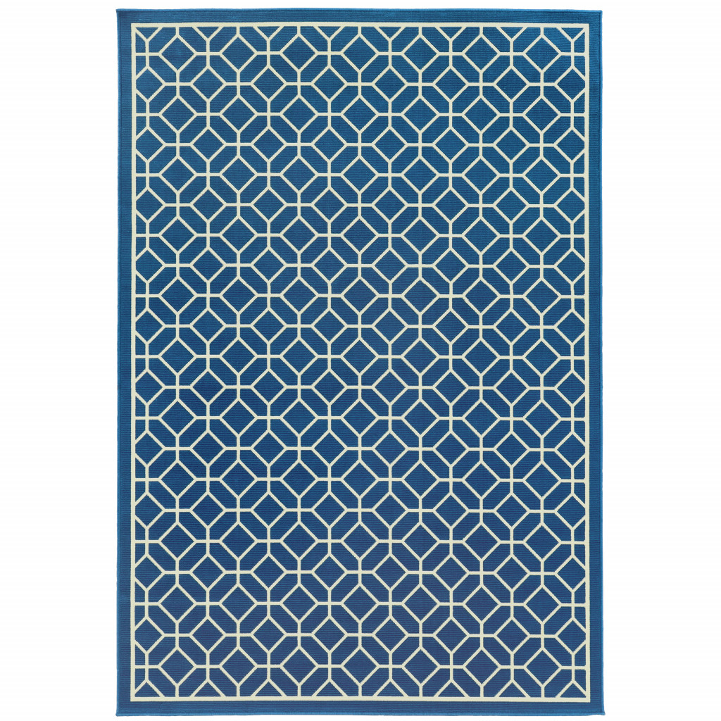 This 9-foot x 13-foot blue and ivory geometric stain resistant indoor outdoor area rug, is a great way to add warmth to a room. This rectangle shaped rug features a geometric design in blue and ivory to give it visual interest. A classic shape marries with good looking design for your space Ideal for spaces with kids and pets, this rug is stain resistant to help repel stains and spilled liquids. Place this area rug against a hardwood or tile floor and it will enliven your living space with style and sophistication. 0.16-inch H x 101.97-inch W x 155.91-inch D