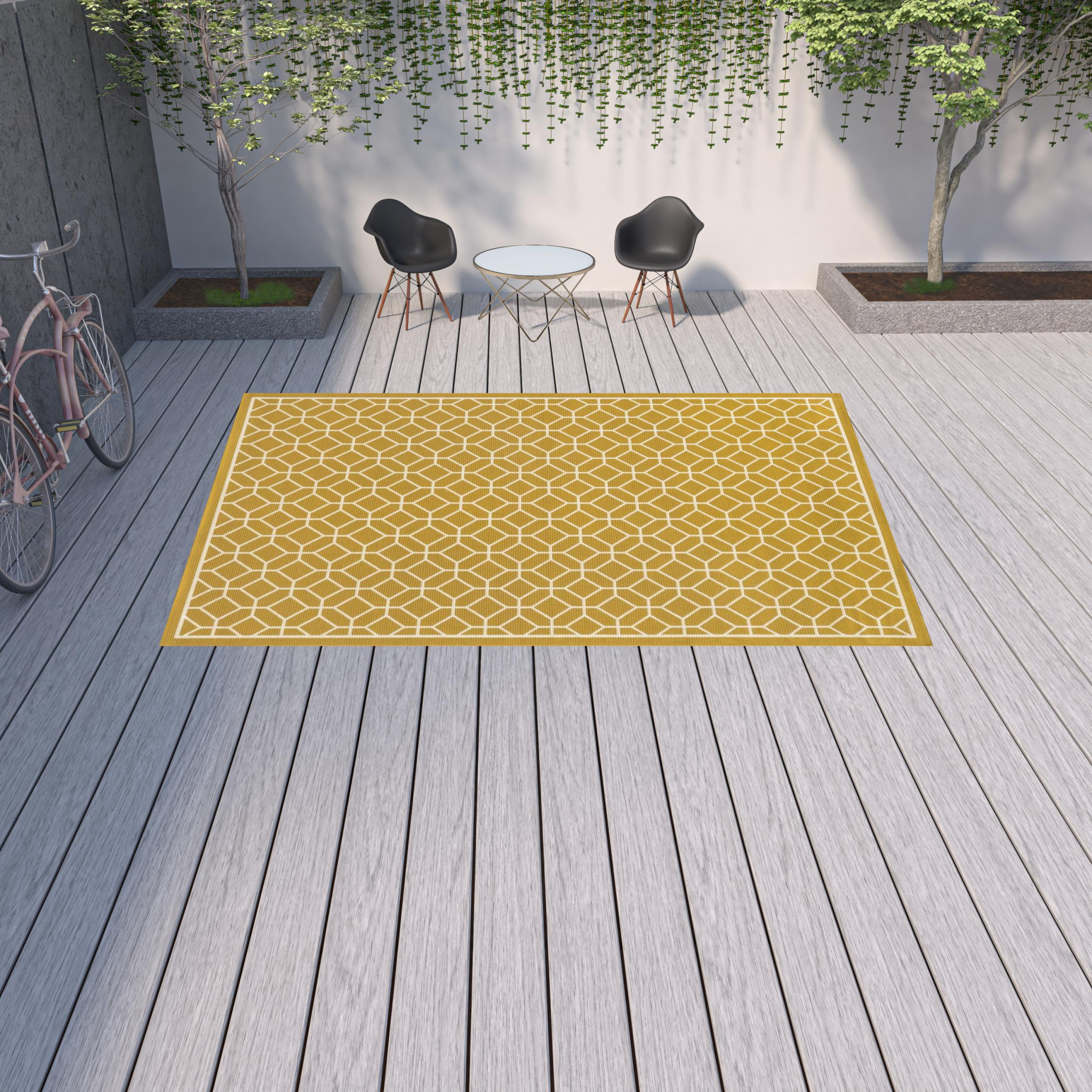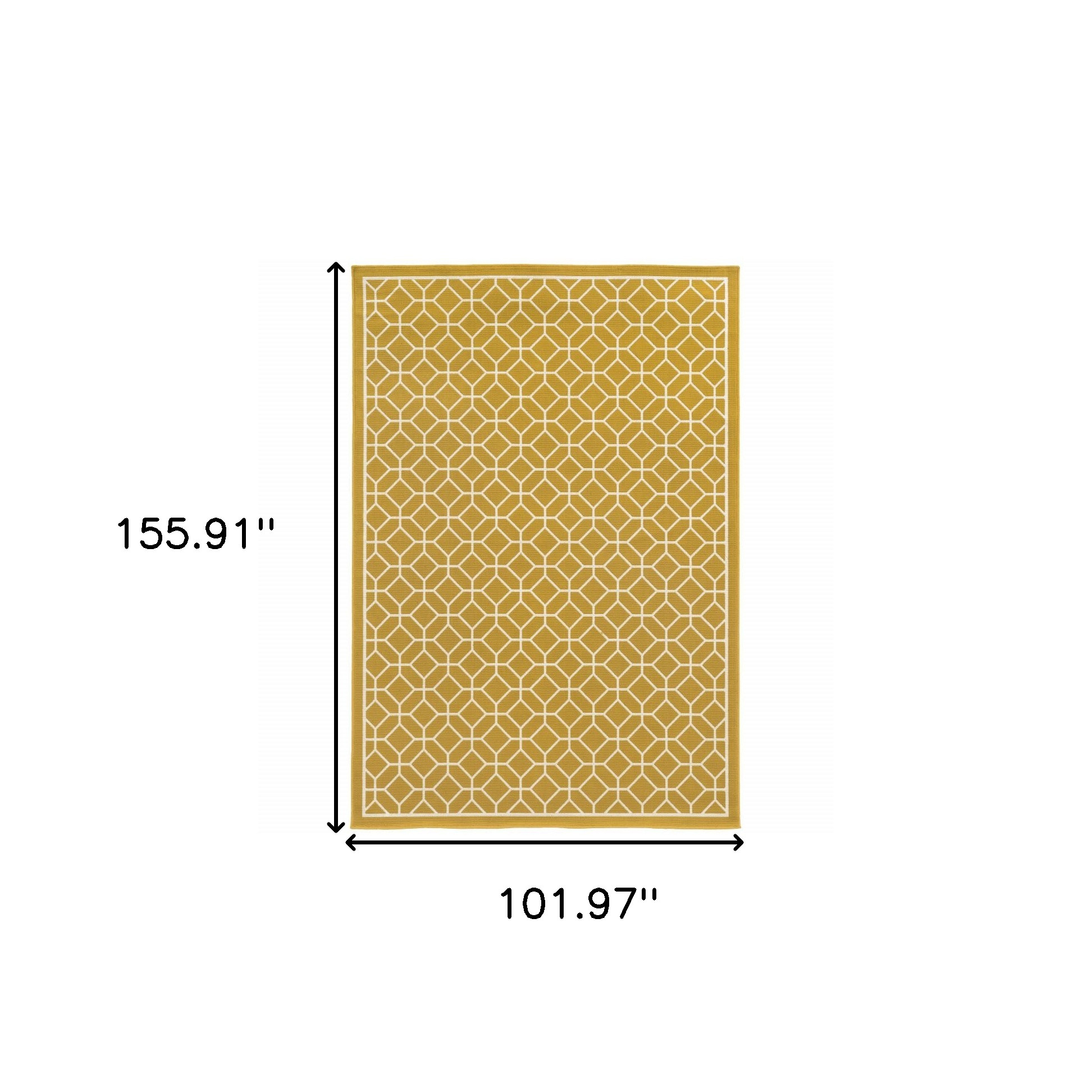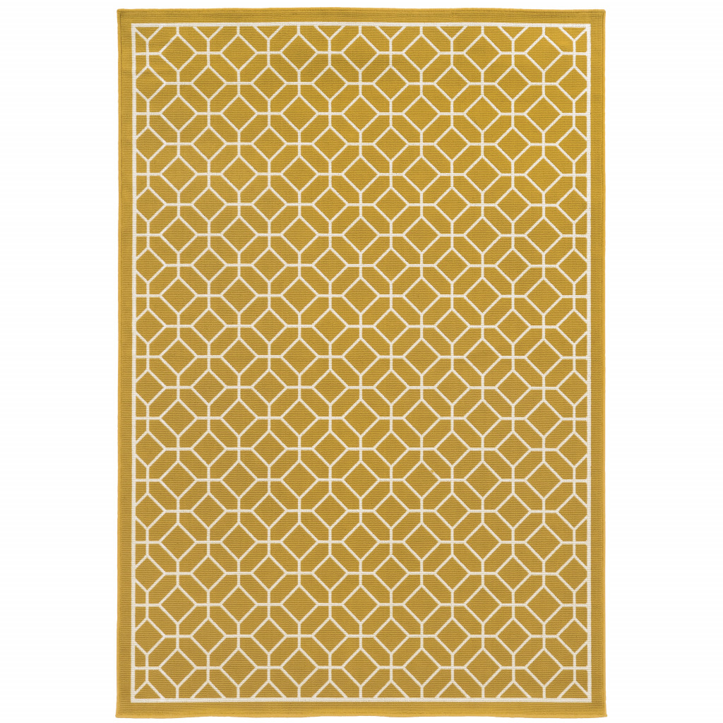 Add great coloration and comfortable texture to your space with this 9-foot x 13-foot gold and ivory geometric stain resistant indoor outdoor area rug. This rectangle shaped rug features a geometric design in gold and ivory to give it visual interest. A classic shape marries with good looking design for your space Ideal for spaces with kids and pets, this rug is stain resistant to help repel stains and spilled liquids. Place this area rug against a hardwood or tile floor and it will enliven your living space with style and sophistication. 0.16-inch H x 101.97-inch W x 155.91-inch D