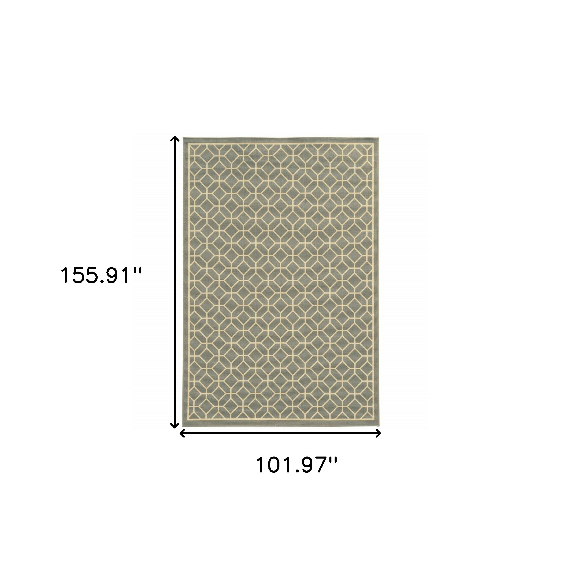 This 9-foot x 13-foot gray and ivory geometric stain resistant indoor outdoor area rug, is a great way to add warmth to a room. This rectangle shaped rug features a geometric design in gray and ivory to give it visual interest. A classic shape marries with good looking design for your space Ideal for spaces with kids and pets, this rug is stain resistant to help repel stains and spilled liquids. Area Rugs help to give warmth and sense of home to your space. 0.16-inch H x 101.97-inch W x 155.91-inch D