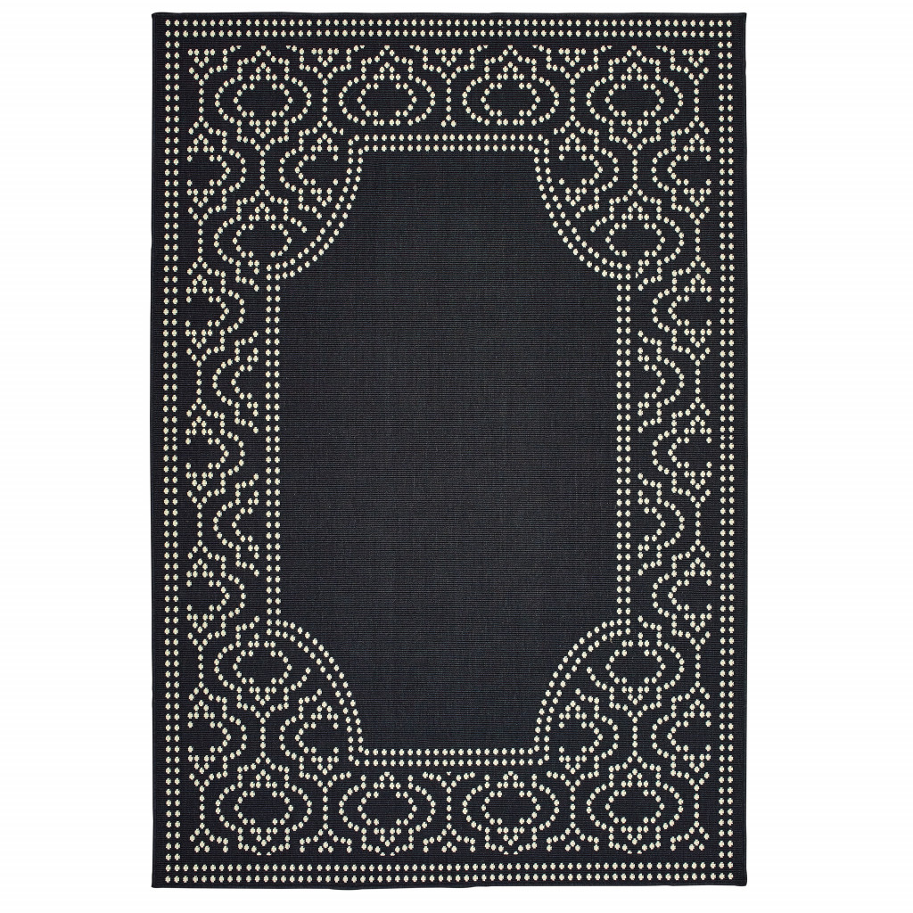 Add some artistry to your room with this 8-foot x 11-foot black and ivory stain resistant indoor outdoor area rug. Ideal for spaces with kids and pets, this rug is stain resistant to help repel stains and spilled liquids. Area Rugs help to give warmth and sense of home to your space. 0.07-inch H x 94.49-inch W x 129.92-inch D