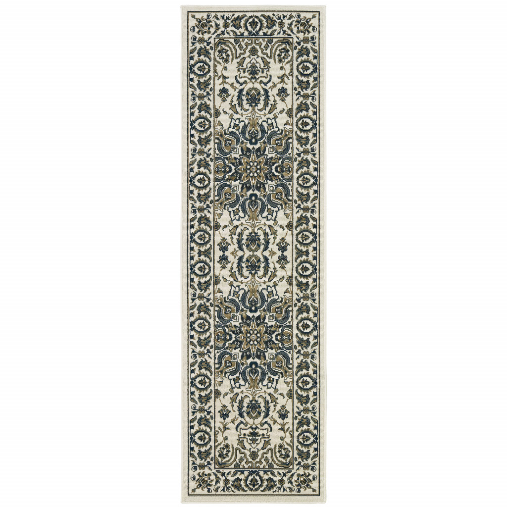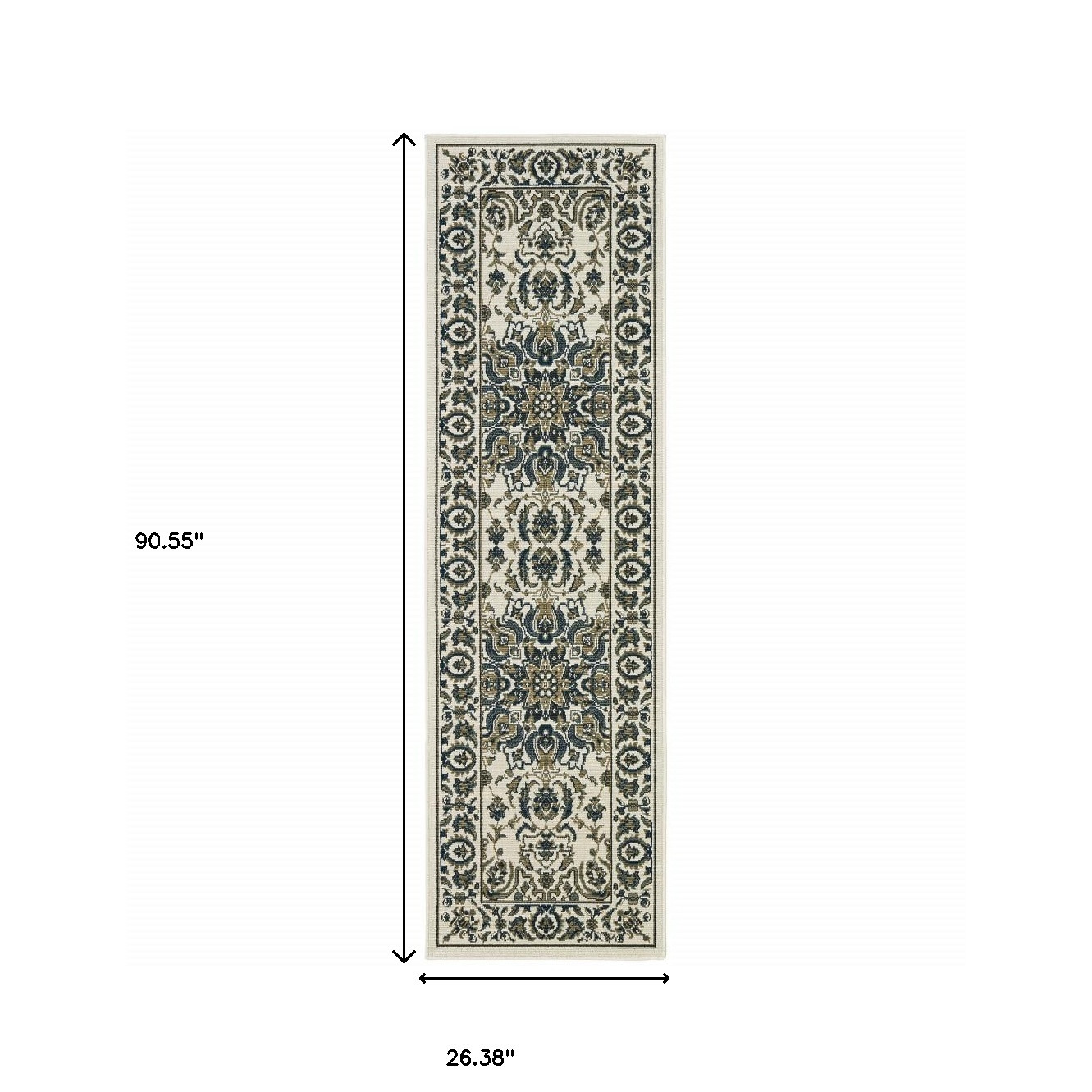 Add some artistry to your room with this 2-foot x 8-foot ivory and blue oriental stain resistant indoor outdoor area rug. This rectangle shaped rug features a oriental design in ivory and blue to give it visual interest. A classic shape marries with good looking design for your space Ideal for spaces with kids and pets, this rug is stain resistant to help repel stains and spilled liquids. Place this area rug against a hardwood or tile floor and it will enliven your living space with style and sophistication. 0.07-inch H x 26.38-inch W x 90.55-inch D