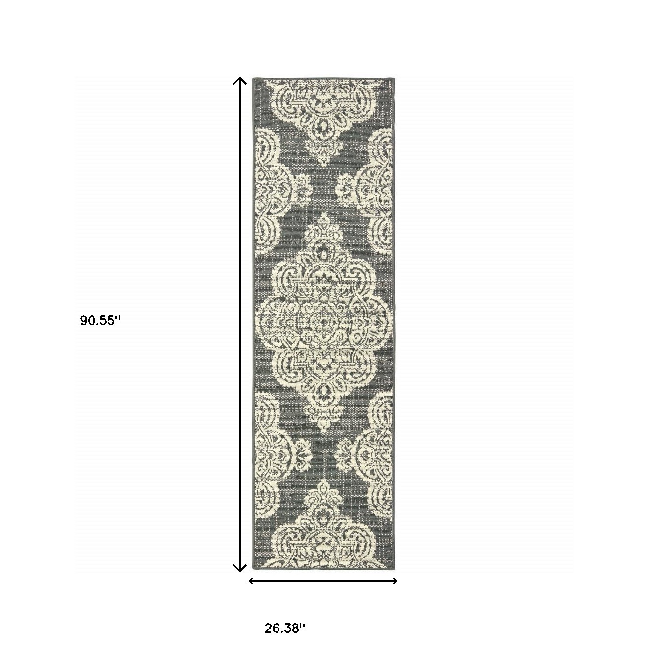 Add great coloration and comfortable texture to your space with this 2-foot x 8-foot gray and ivory oriental stain resistant indoor outdoor area rug. This rectangle shaped rug features a oriental design in gray and ivory to give it visual interest. A classic shape marries with good looking design for your space Ideal for spaces with kids and pets, this rug is stain resistant to help repel stains and spilled liquids. Place this area rug against a hardwood or tile floor and it will enliven your living space with style and sophistication. 0.07-inch H x 26.38-inch W x 90.55-inch D