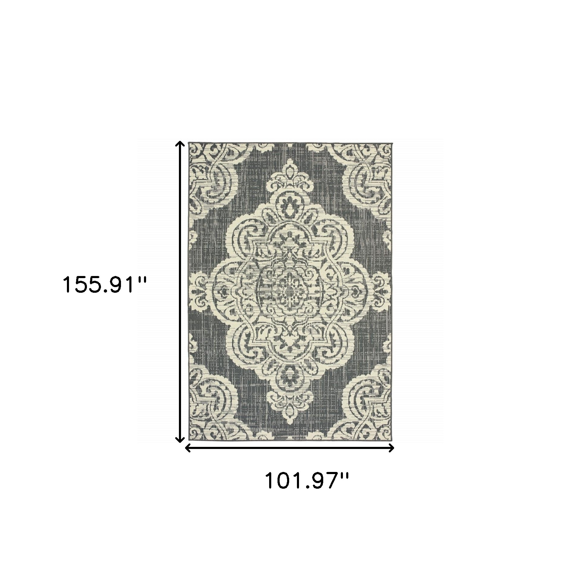 This 9-foot x 13-foot gray and ivory oriental stain resistant indoor outdoor area rug, is a great way to add warmth to a room. This rectangle shaped rug features a oriental design in gray and ivory to give it visual interest. A classic shape marries with good looking design for your space Ideal for spaces with kids and pets, this rug is stain resistant to help repel stains and spilled liquids. Area Rugs help to give warmth and sense of home to your space. 0.07-inch H x 101.97-inch W x 155.91-inch D
