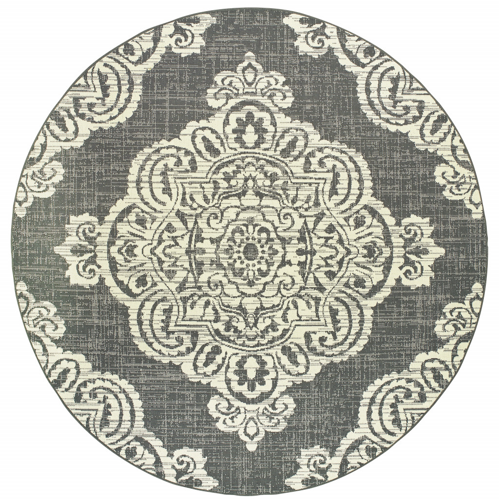 Set an inviting tone in your space with this 8-foot x 8-foot gray and ivory round oriental stain resistant indoor outdoor area rug. This geometric round shaped rug features a oriental pattern in gray and ivory that combines a good looking print with a unique and updated shape. The mix of shape, color, and design gives this rug refreshing visual interest. Ideal for spaces with kids and pets, this rug is stain resistant to help repel stains and spilled liquids. Area Rugs help to give warmth and sense of home to your space. 0.07-inch H x 94.49-inch W x 94.49-inch D