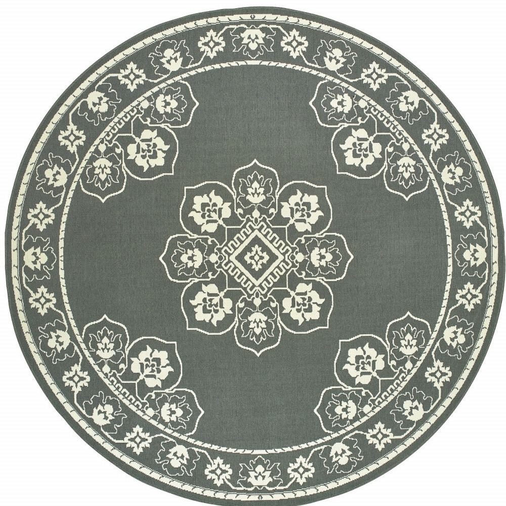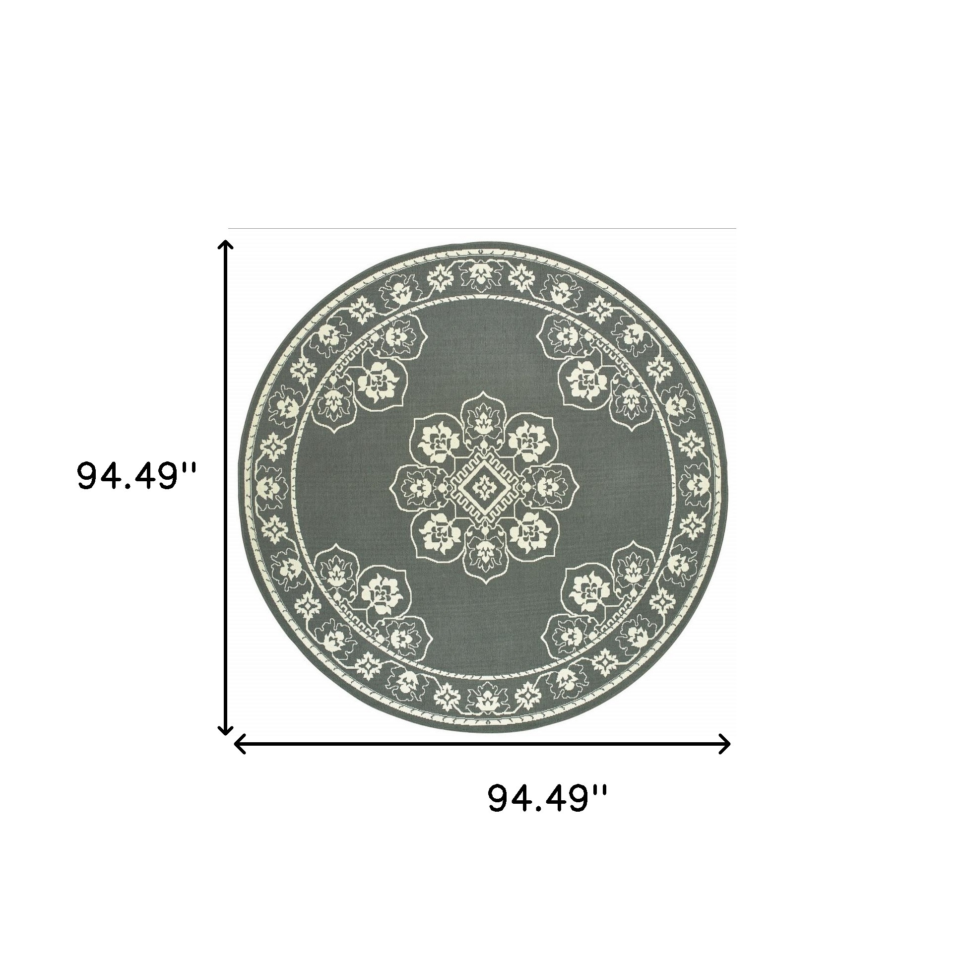 Set an inviting tone in your space with this 8-foot x 8-foot gray and ivory round oriental stain resistant indoor outdoor area rug. This geometric round shaped rug features a oriental pattern in gray and ivory that combines a good looking print with a unique and updated shape. The mix of shape, color, and design gives this rug refreshing visual interest. Ideal for spaces with kids and pets, this rug is stain resistant to help repel stains and spilled liquids. Area Rugs help to give warmth and sense of home to your space. 0.07-inch H x 94.49-inch W x 94.49-inch D