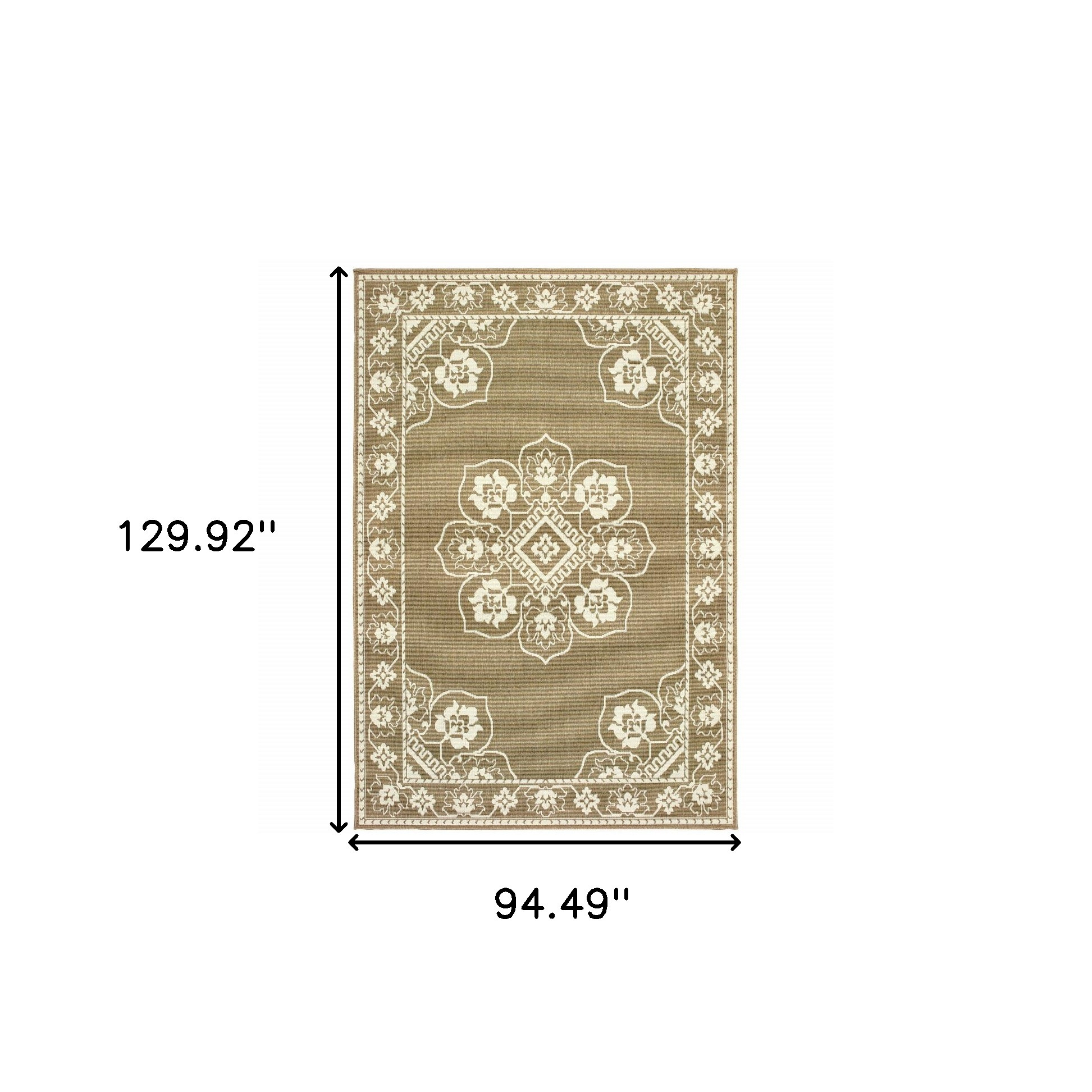 Add some artistry to your room with this 8-foot x 11-foot tan oriental stain resistant indoor outdoor area rug. This rectangle shaped rug features a oriental design in tan to give it visual interest. A classic shape marries with good looking design for your space Ideal for spaces with kids and pets, this rug is stain resistant to help repel stains and spilled liquids. Place this area rug against a hardwood or tile floor and it will enliven your living space with style and sophistication. 0.07-inch H x 94.49-inch W x 129.92-inch D