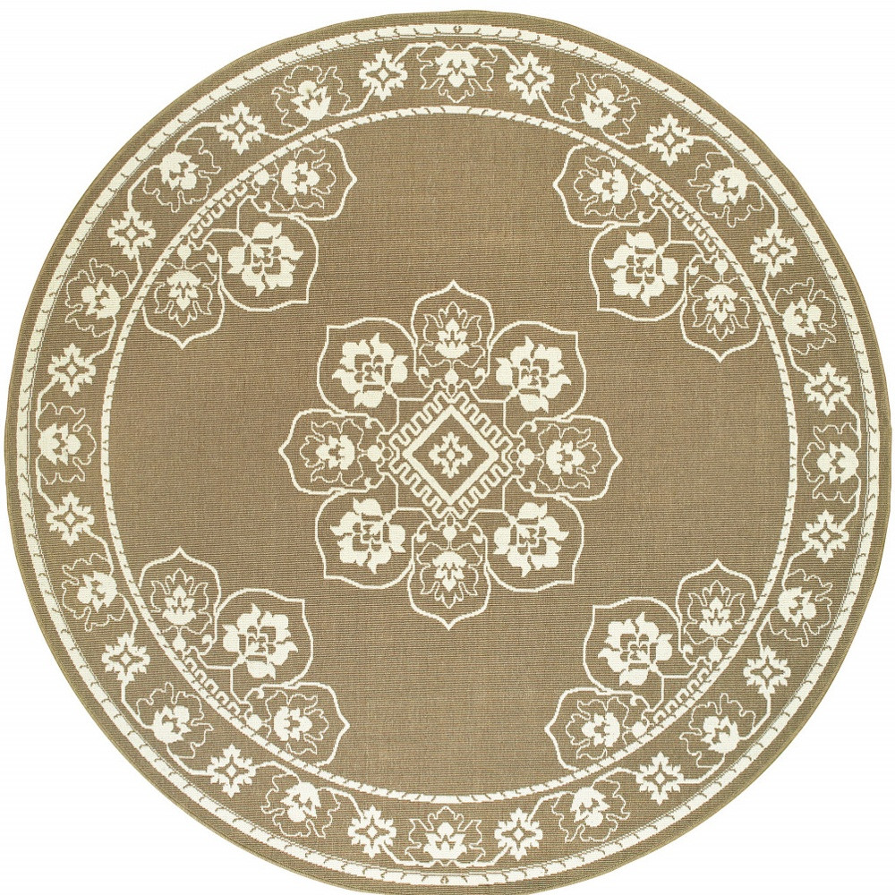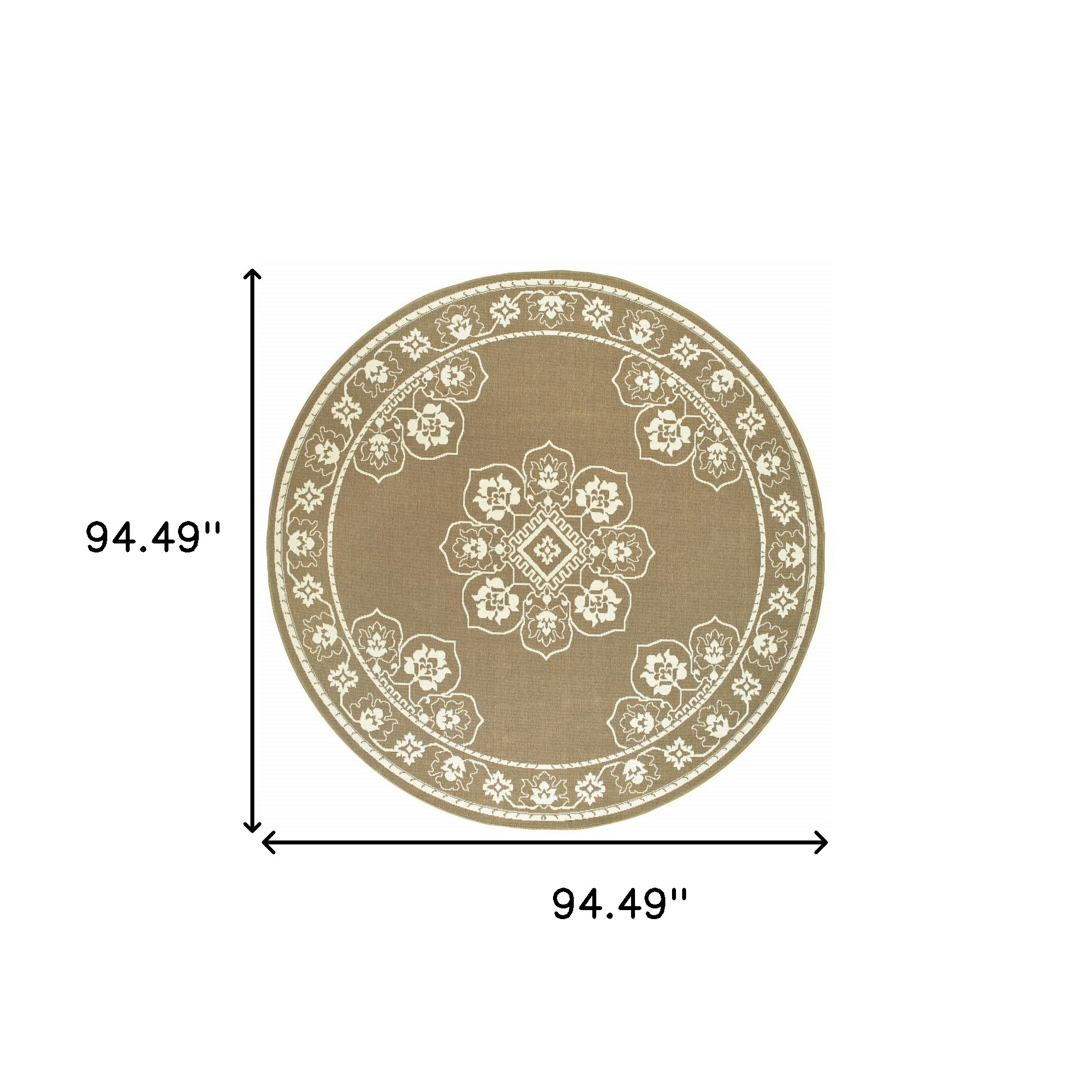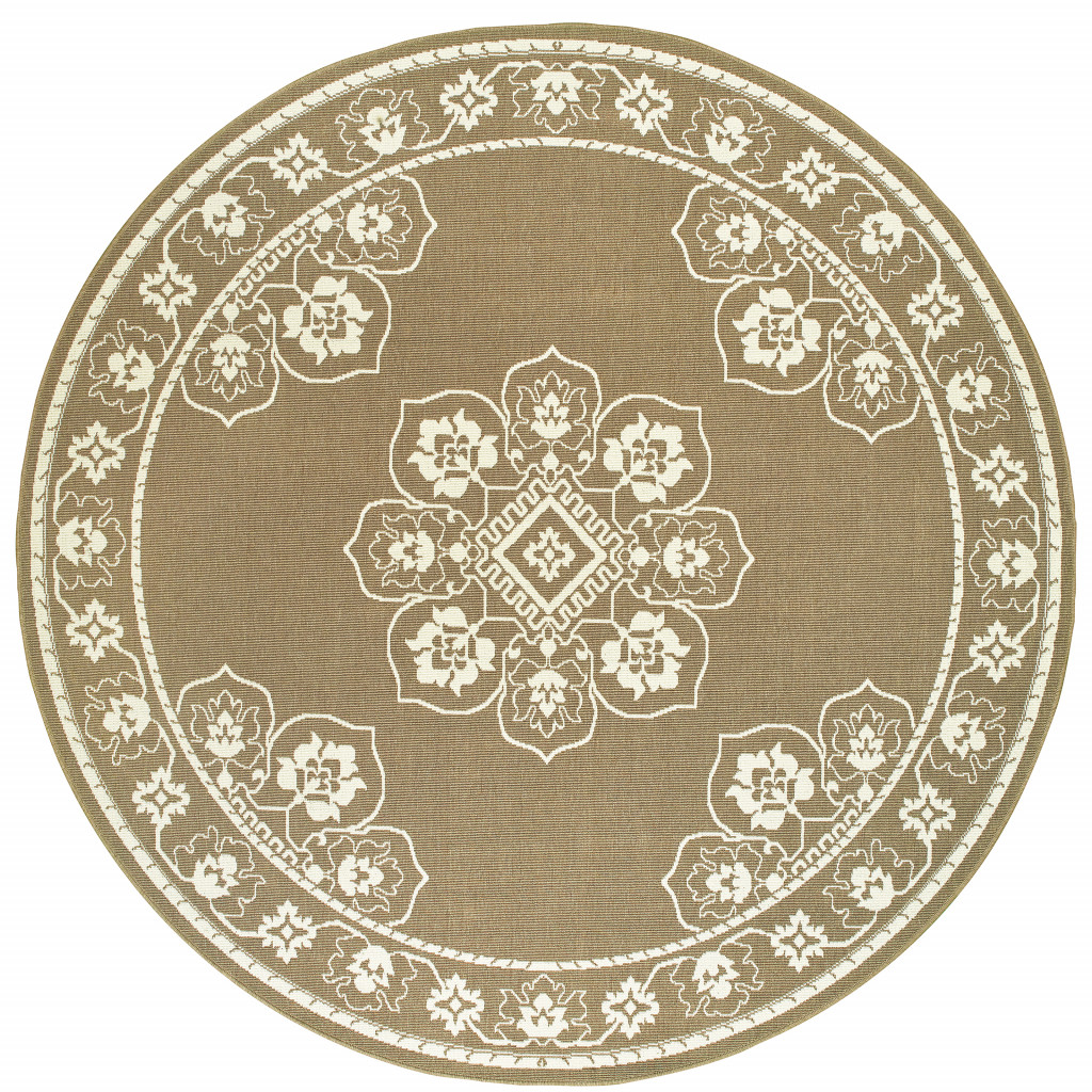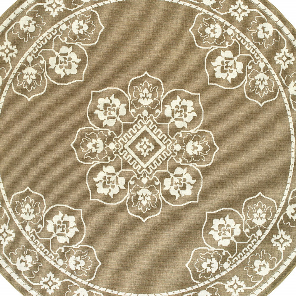 Add some artistry to your room with this 8-foot x 8-foot tan round oriental stain resistant indoor outdoor area rug. This geometric round shaped rug features a oriental pattern in tan that combines a good looking print with a unique and updated shape. The mix of shape, color, and design gives this rug refreshing visual interest. Ideal for spaces with kids and pets, this rug is stain resistant to help repel stains and spilled liquids. Area Rugs help to give warmth and sense of home to your space. 0.07-inch H x 94.49-inch W x 94.49-inch D