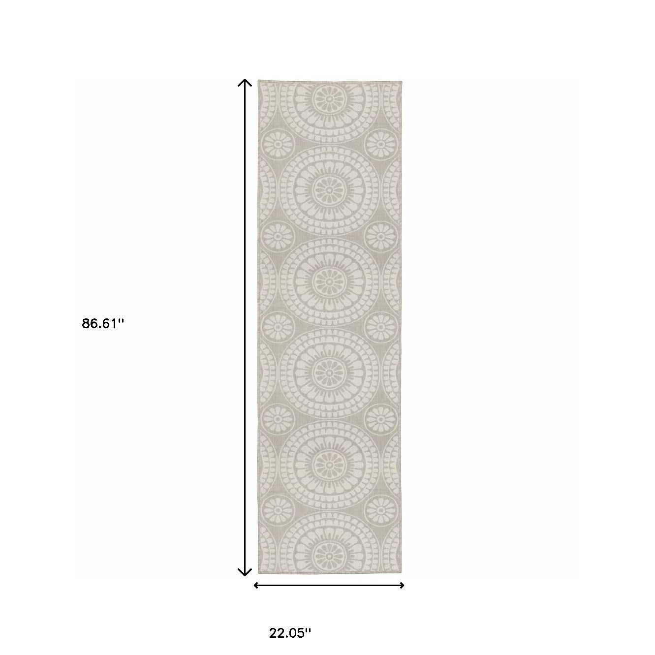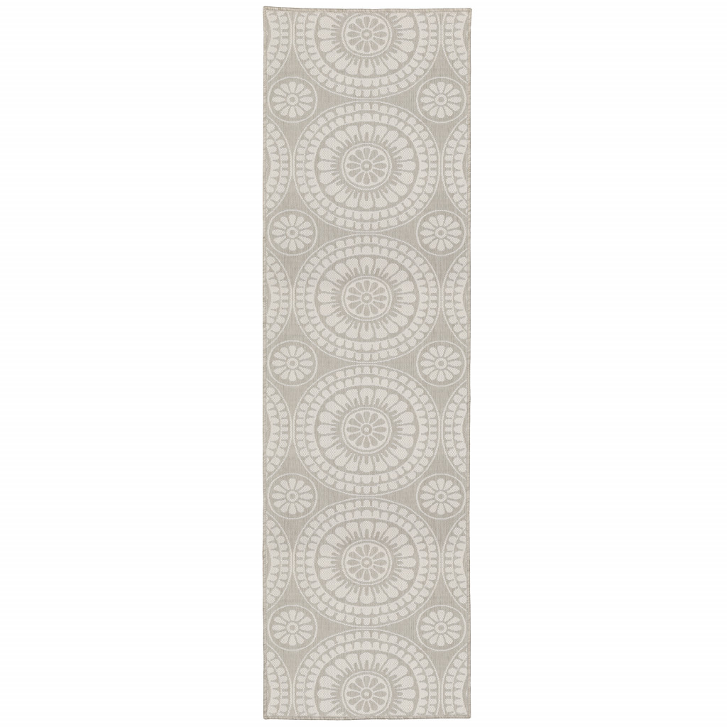 Set an inviting tone in your space with this 2-foot x 7-foot gray and ivory geometric stain resistant indoor outdoor area rug. This rectangle shaped rug features a geometric design in gray and ivory to give it visual interest. A classic shape marries with good looking design for your space Ideal for spaces with kids and pets, this rug is stain resistant to help repel stains and spilled liquids. Area Rugs help to give warmth and sense of home to your space. 0.07-inch H x 22.05-inch W x 86.61-inch D