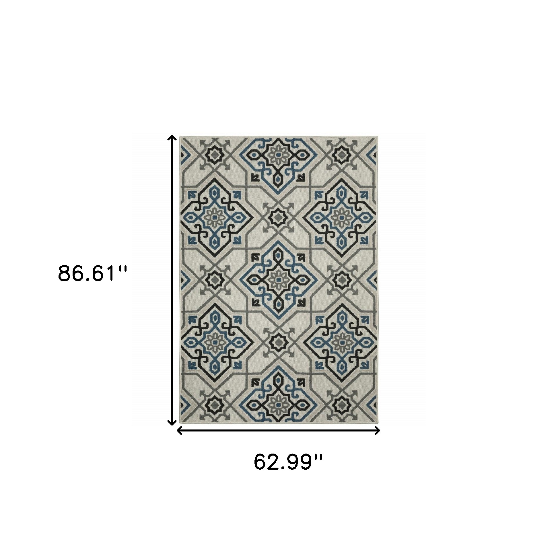 Set an inviting tone in your space with this 5-foot x 7-foot blue and beige oriental stain resistant indoor outdoor area rug. This rectangle shaped rug features a oriental design in blue and beige to give it visual interest. A classic shape marries with good looking design for your space Ideal for spaces with kids and pets, this rug is stain resistant to help repel stains and spilled liquids. Area Rugs help to give warmth and sense of home to your space. 0.15-inch H x 62.99-inch W x 86.61-inch D