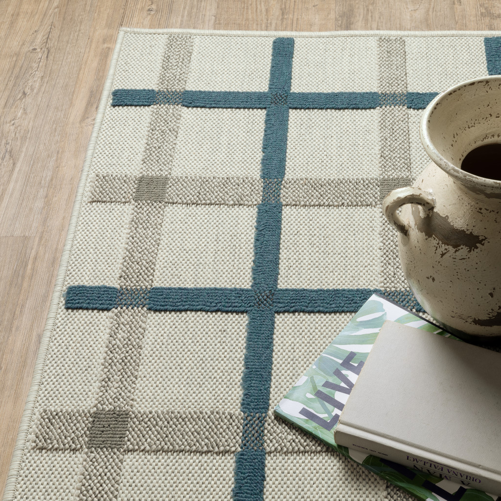 2' X 4' Blue and Beige Geometric Stain Resistant Indoor Outdoor Area Rug