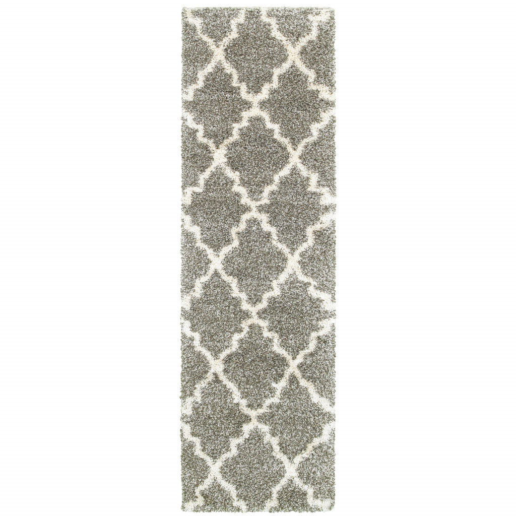 This 2' x 8' grey and ivory geometric shag power loom stain resistant runner rug, is a great way to add warmth to a room. This runner shaped rug features a geometric design in grey and ivory to give it visual interest. A classic shape marries with good looking design for your space Ideal for spaces with kids and pets, this rug is stain resistant to help repel stains and spilled liquids. The retro shag construction of this luxurious rug will provide a soft and comfortable barrier to color tile and hardwood floors. Place this area rug against a hardwood or tile floor and it will enliven your living space with style and sophistication. 1.96" H x 26.77" W x 90.55" D