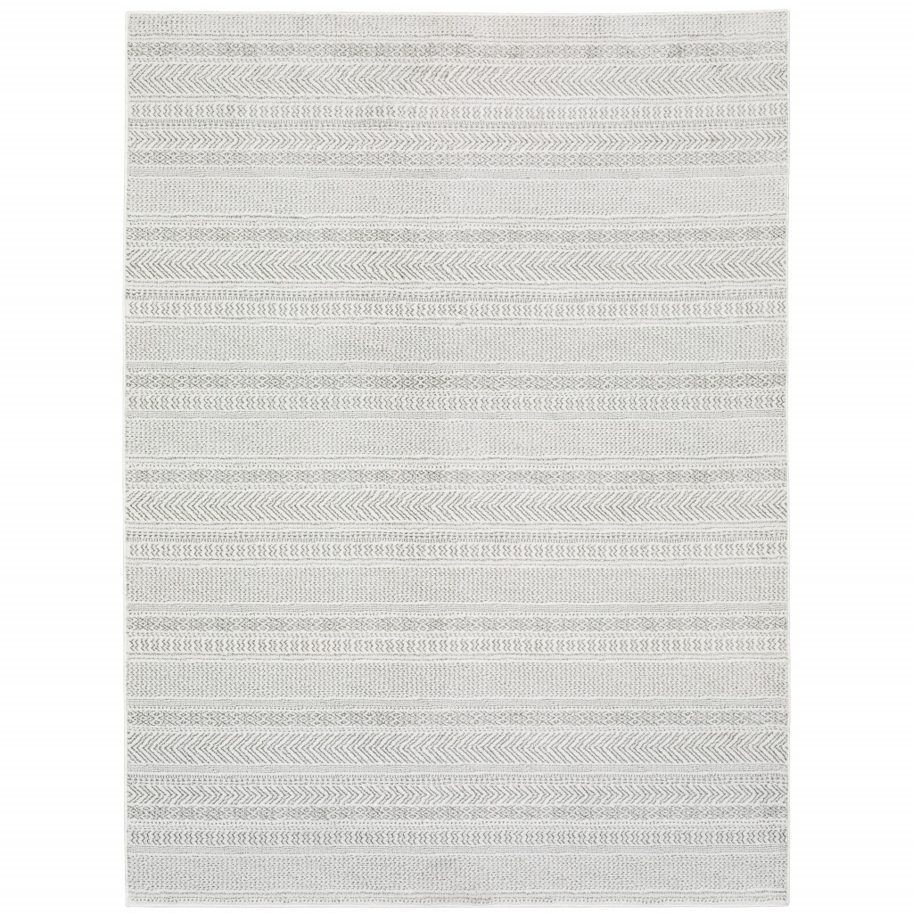 This 5' x 8' white and grey geometric power loom stain resistant area rug, is a great way to add warmth to a room. This rectangle shaped rug features a geometric design in white and grey to give it visual interest. A classic shape marries with good looking design for your space Ideal for spaces with kids and pets, this rug is stain resistant to help repel stains and spilled liquids. Place this area rug against a hardwood or tile floor and it will enliven your living space with style and sophistication. 0.31" H x 62.99" W x 92.52" D