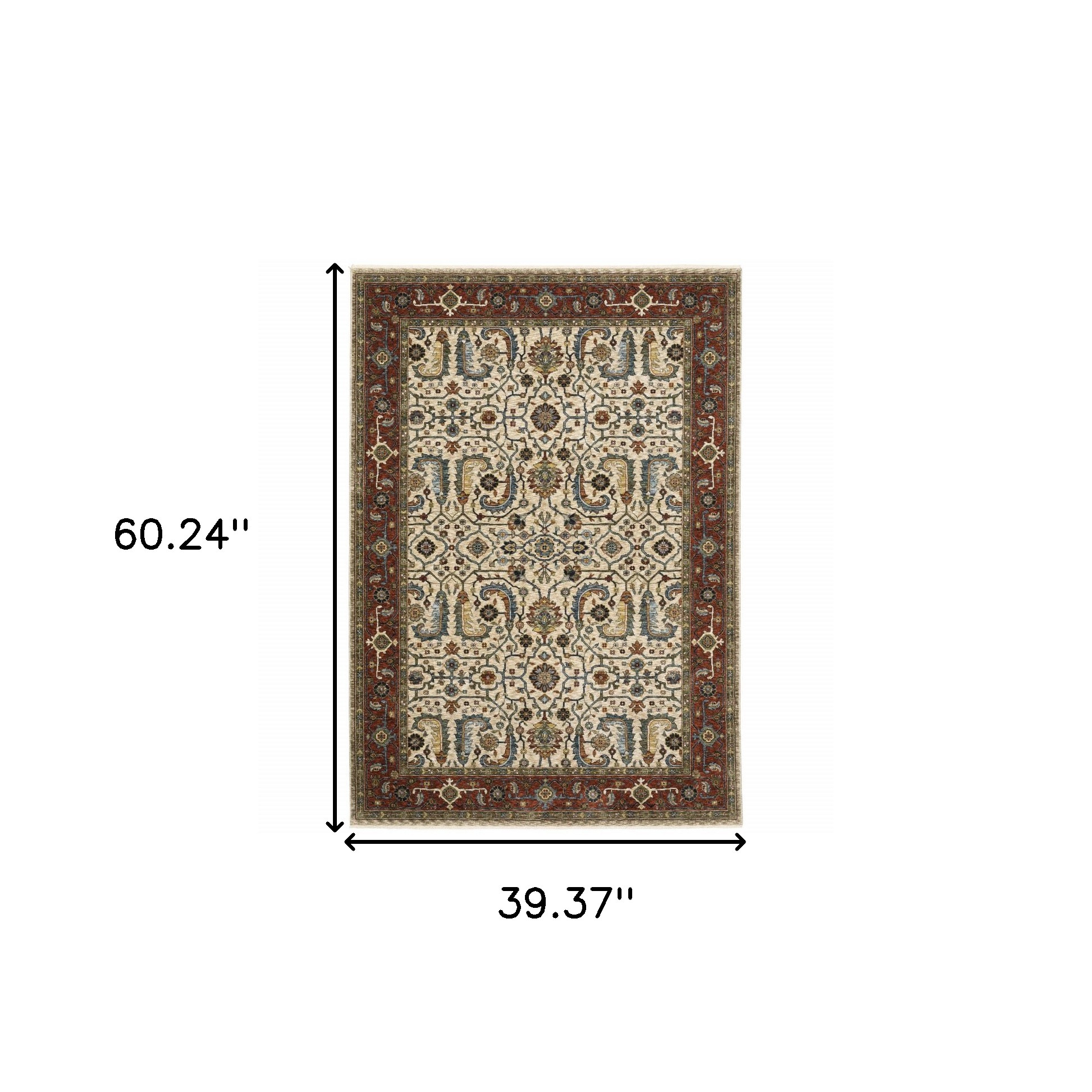 Add some artistry to your room with this 3' x 5' ivory red green grey blue and navy oriental power loom stain resistant area rug with fringe. This rectangle shaped rug features a oriental design in ivory red green grey blue and navy to give it visual interest. A classic shape marries with good looking design for your space Ideal for spaces with kids and pets, this rug is stain resistant to help repel stains and spilled liquids. Tassel ends bring a timeless and fashionable look to your interior. Place this area rug against a hardwood or tile floor and it will enliven your living space with style and sophistication. 0.24" H x 39.37" W x 60.24" D