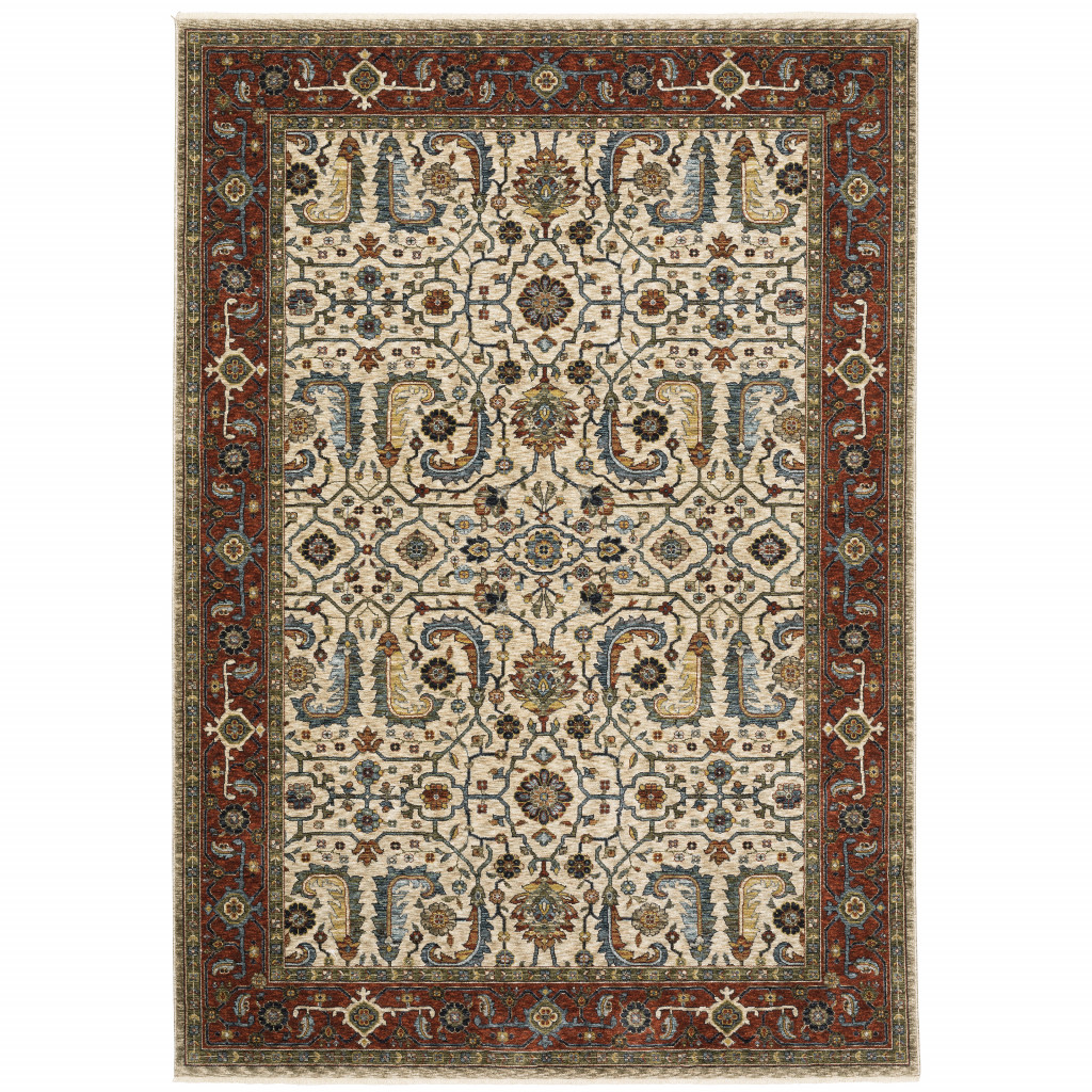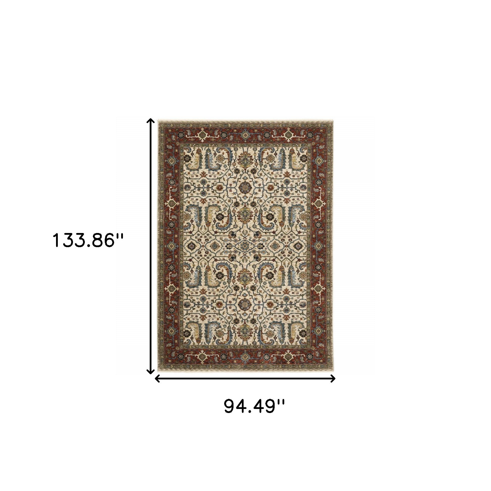 Set an inviting tone in your space with this 8-foot x 11-foot ivory and red oriental area rug with fringe. Ideal for spaces with kids and pets, this rug is stain resistant to help repel dirt and spilled liquids. Built to last, this rug crafted from polyester fibers is known for its durability and long lasting appeal. Rugs are a great way to showcase your style, hide imperfections, warm your home and reduce noise. Tassel ends bring a timeless and fashionable look to your interior. 94.49-inch h x 133.86-inch w x 0.24-inch d.