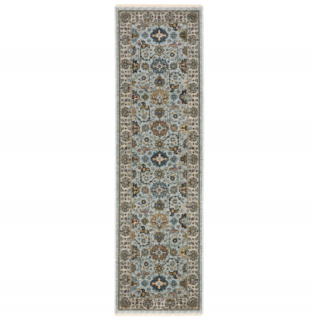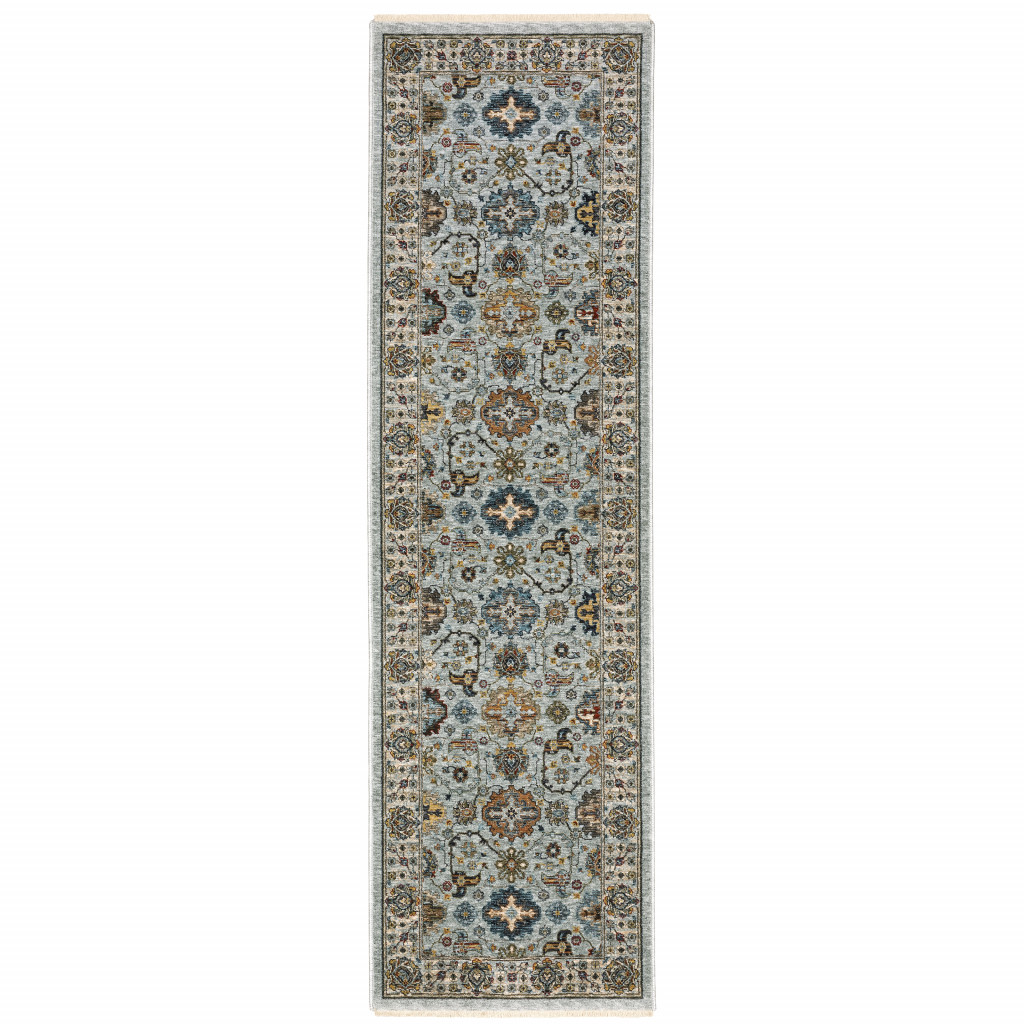 Add some artistry to your room with this 8' blue and ivory oriental power loom runner rug with fringe. This runner shaped rug features a oriental design in blue and ivory to give it visual interest. A classic shape marries with good looking design for your space Ideal for spaces with kids and pets, this rug is stain resistant to help repel stains and spilled liquids. Tassel ends bring a timeless and fashionable look to your interior. Area Rugs help to give warmth and sense of home to your space. 0.24" H x 26.77" W x 92.52" D