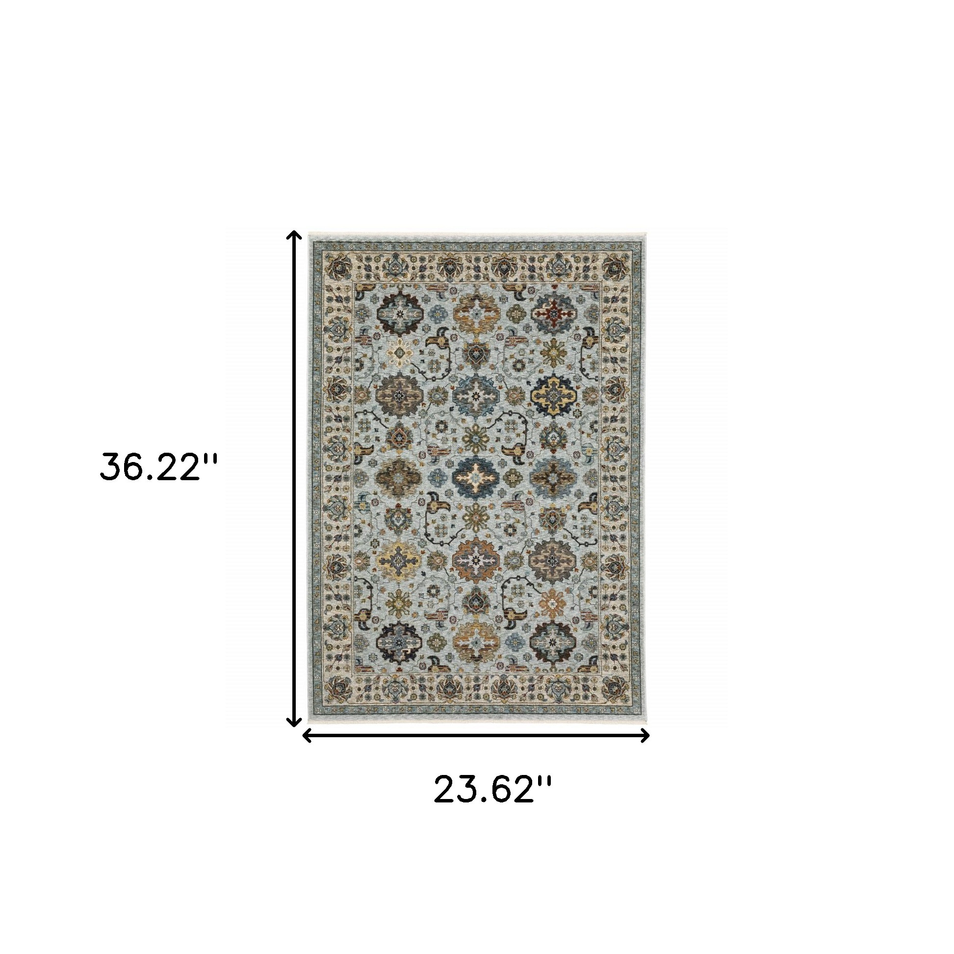 Add great coloration and comfortable texture to your space with this 2' x 3' blue beige grey green yellow and rust oriental power loom stain resistant area rug with fringe. This rectangle shaped rug features a oriental design in blue beige grey green yellow and rust to give it visual interest. A classic shape marries with good looking design for your space Ideal for spaces with kids and pets, this rug is stain resistant to help repel stains and spilled liquids. Tassel ends bring a timeless and fashionable look to your interior. Place this area rug against a hardwood or tile floor and it will enliven your living space with style and sophistication. 0.24" H x 23.62" W x 36.22" D