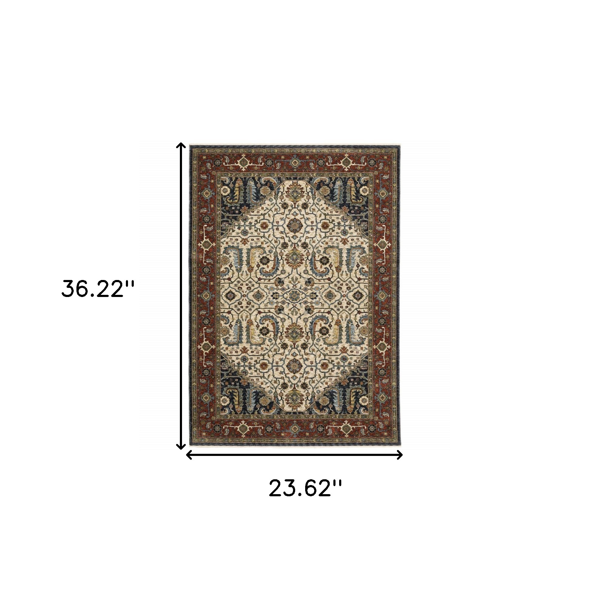 Add some artistry to your room with this 2' x 3' ivory beige red blue gold green and navy oriental power loom stain resistant area rug with fringe. This rectangle shaped rug features a oriental design in ivory beige red blue gold green and navy to give it visual interest. A classic shape marries with good looking design for your space Ideal for spaces with kids and pets, this rug is stain resistant to help repel stains and spilled liquids. Tassel ends bring a timeless and fashionable look to your interior. Place this area rug against a hardwood or tile floor and it will enliven your living space with style and sophistication. 0.24" H x 23.62" W x 36.22" D
