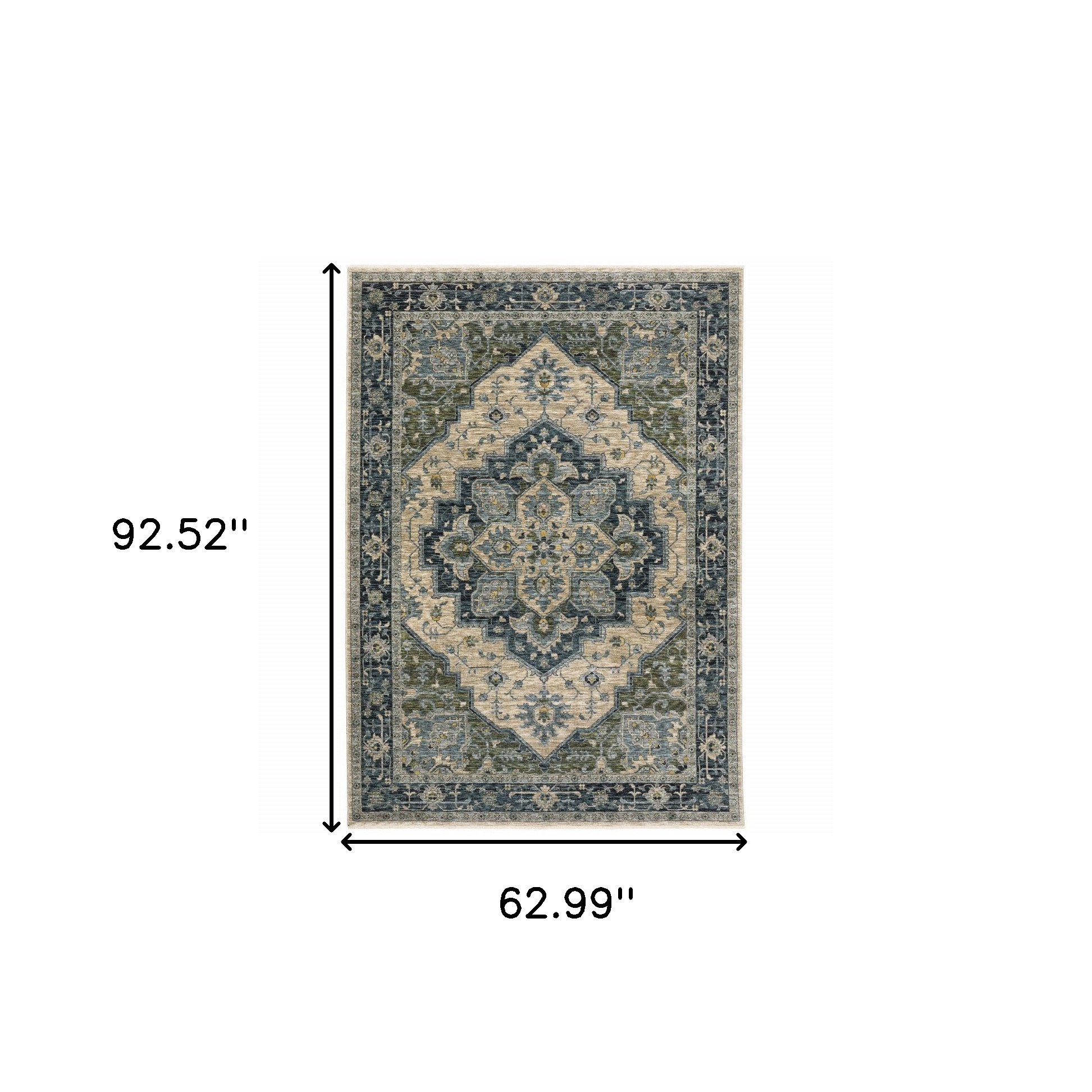 Add great coloration and comfortable texture to your space with this 5' x 8' blue grey beige tan green and gold oriental power loom stain resistant area rug with fringe. This rectangle shaped rug features a oriental design in blue grey beige tan green and gold to give it visual interest. A classic shape marries with good looking design for your space Ideal for spaces with kids and pets, this rug is stain resistant to help repel stains and spilled liquids. Tassel ends bring a timeless and fashionable look to your interior. Area Rugs help to give warmth and sense of home to your space. 0.24" H x 62.99" W x 92.52" D