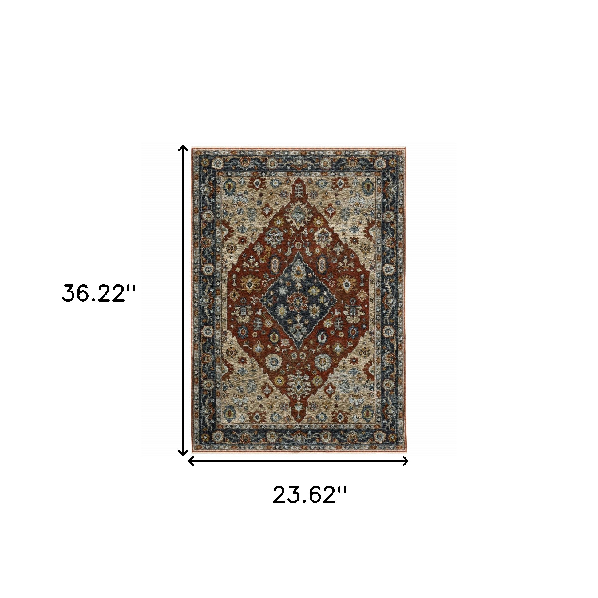 Add some artistry to your room with this 2' x 3' blue beige tan brown gold and rust red oriental power loom stain resistant area rug with fringe. This rectangle shaped rug features a oriental design in blue beige tan brown gold and rust red to give it visual interest. A classic shape marries with good looking design for your space Ideal for spaces with kids and pets, this rug is stain resistant to help repel stains and spilled liquids. Tassel ends bring a timeless and fashionable look to your interior. Area Rugs help to give warmth and sense of home to your space. 0.24" H x 23.62" W x 36.22" D