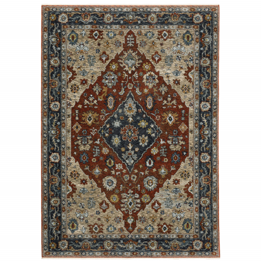 Set an inviting tone in your space with this 3' x 5' blue beige tan brown gold and rust red oriental power loom stain resistant area rug with fringe. This rectangle shaped rug features a oriental design in blue beige tan brown gold and rust red to give it visual interest. A classic shape marries with good looking design for your space Ideal for spaces with kids and pets, this rug is stain resistant to help repel stains and spilled liquids. Tassel ends bring a timeless and fashionable look to your interior. Area Rugs help to give warmth and sense of home to your space. 0.24" H x 39.37" W x 60.24" D