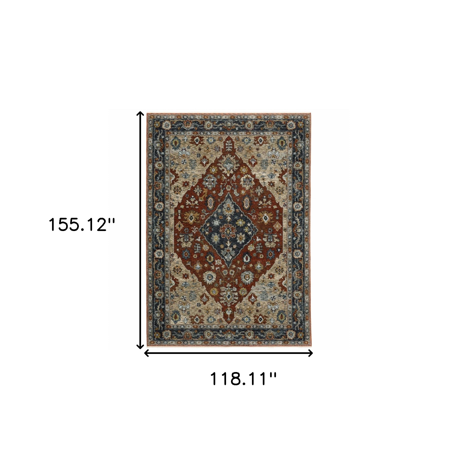 Add great coloration and comfortable texture to your space with this 10' x 13' blue beige tan brown gold and rust red oriental power loom stain resistant area rug with fringe. This rectangle shaped rug features a oriental design in blue beige tan brown gold and rust red to give it visual interest. A classic shape marries with good looking design for your space Ideal for spaces with kids and pets, this rug is stain resistant to help repel stains and spilled liquids. Tassel ends bring a timeless and fashionable look to your interior. Area Rugs help to give warmth and sense of home to your space. 0.24" H x 118.11" W x 155.12" D