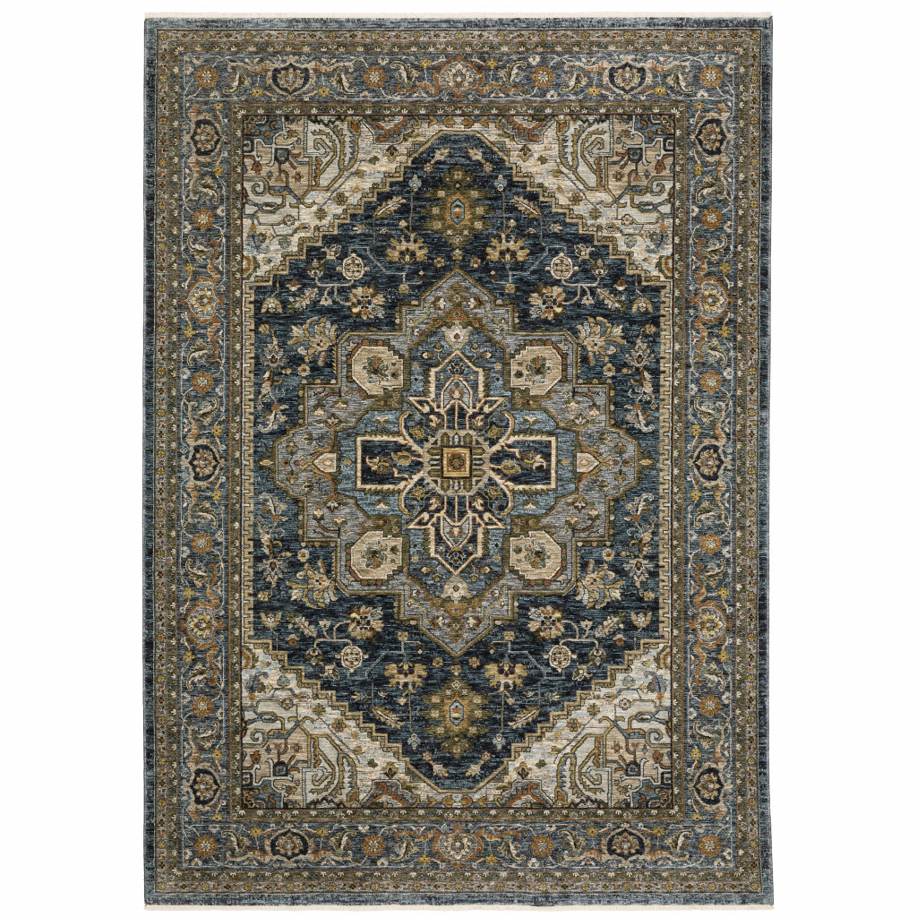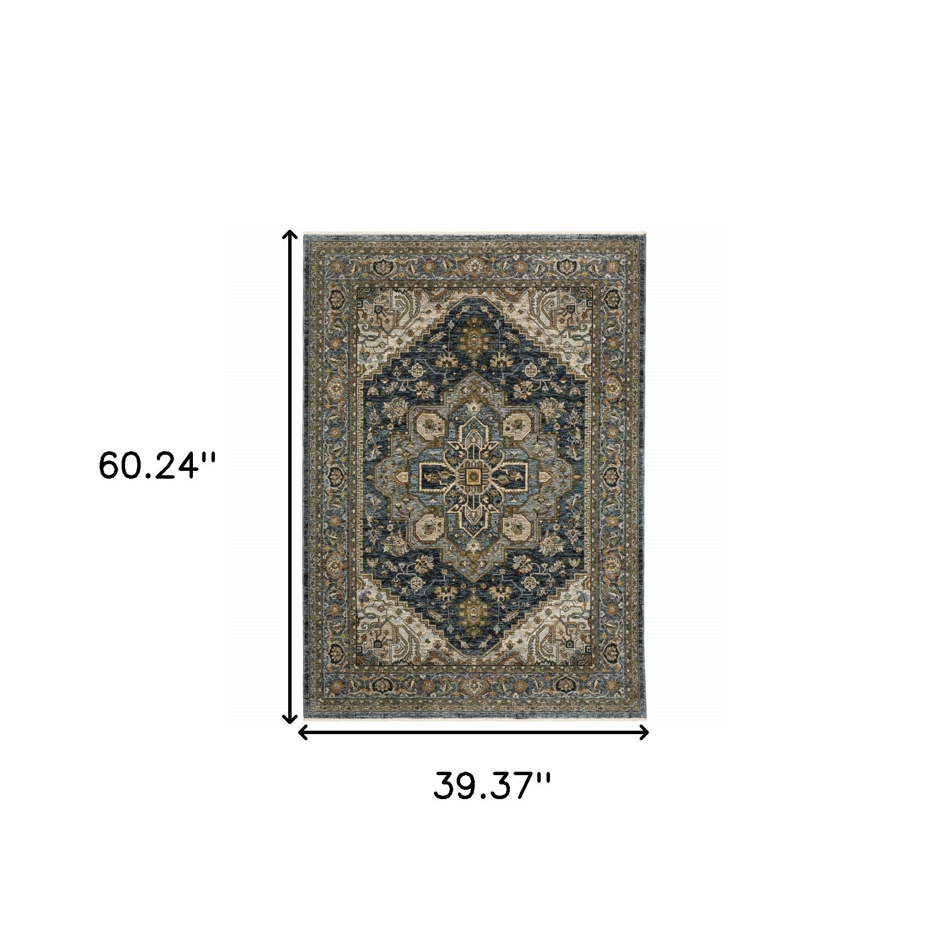 This 3' x 5' blue taupe grey green rust tan beige and gold oriental power loom stain resistant area rug with fringe, is a great way to add warmth to a room. This rectangle shaped rug features a oriental design in blue taupe grey green rust tan beige and gold to give it visual interest. A classic shape marries with good looking design for your space Ideal for spaces with kids and pets, this rug is stain resistant to help repel stains and spilled liquids. Tassel ends bring a timeless and fashionable look to your interior. Place this area rug against a hardwood or tile floor and it will enliven your living space with style and sophistication. 0.24" H x 39.37" W x 60.24" D